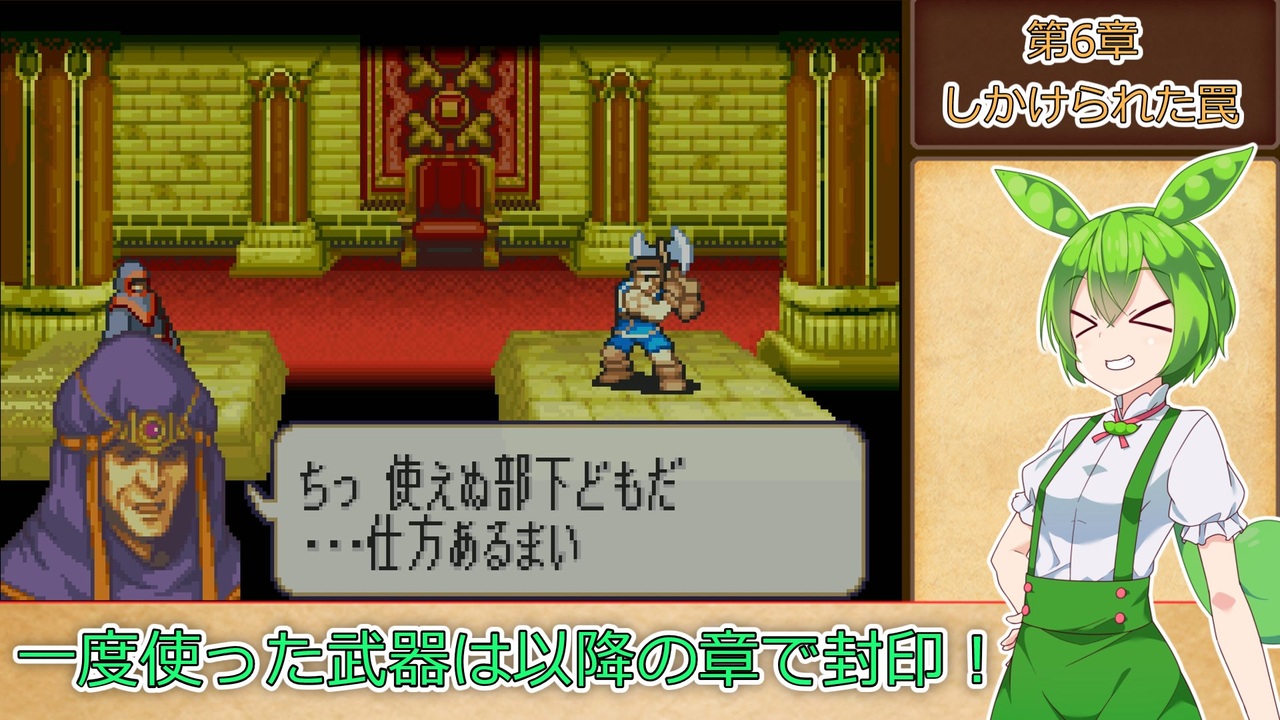 <span style="color: #85200c; font-size: 18px;"><strong><i>覚醒の戦士ワード編</i></strong></span><br><br><strong>ルール1:一度使用した武器は、以降の章で使用する事を禁止する。<br>ルール2:武器の使用の定義は『その武器を装備した状態で敵との戦闘が発生したタイミング』『その武器を売却して換金した場合』杖の場合は『対象に対して使用した時点(命中の可否は問わない)』とする。<br>ルール3:難易度はハードとする。<br>ルール4:1章から終章まで全ての章を攻略し、仲間に出来るユニットは全員加入させ、生存させる。</strong><br><span style="color: #ff0000;"><strong>※ただしルート分岐次第で行けない章、加入出来ない仲間は除外。</strong></span><br><br>本動画のシリーズリスト【<a href="https://www.nicovideo.jp/series/316824" target="_blank" rel="noopener">series/316824</a>】<br>part1【<a href="https://www.nicovideo.jp/watch/sm40376370" class="watch">sm40376370</a>】<br>前:【<a href="https://www.nicovideo.jp/watch/sm40582347" class="watch">sm40582347</a>】次:【<a href="https://www.nicovideo.jp/watch/sm40700648" class="watch">sm40700648</a>】<br><br><strong>使用したソフト</strong><br>VOICEROID+東北きりたんEX<br>VOICEROID+東北ずん子EX<br>VOICEROID2 東北イタコ<br>VOICEVOX:ずんだもん<br><strong>お借りした立ち絵</strong><br>【<a href="https://seiga.nicovideo.jp/seiga/im10626877" target="_blank" rel="noopener">im10626877</a>】【<a href="https://seiga.nicovideo.jp/seiga/im10910197" target="_blank" rel="noopener">im10910197</a>】【<a href="https://seiga.nicovideo.jp/seiga/im10886085" target="_blank" rel="noopener">im10886085</a>】【<a href="https://seiga.nicovideo.jp/seiga/im10572401" target="_blank" rel="noopener">im10572401</a>】<br><strong>お借りした素材</strong><br>ニコニコモンズの皆様(コンテンツツリー参照)