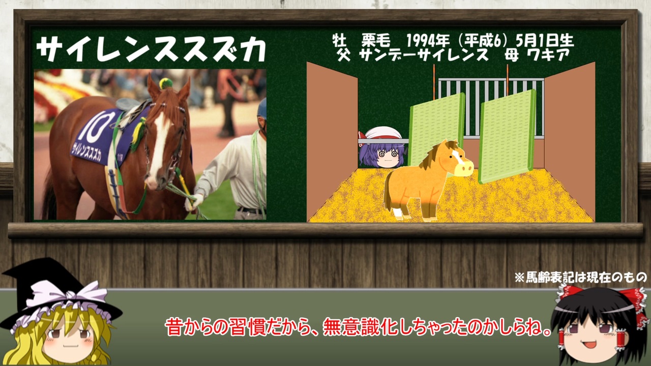 前作<a href="https://www.nicovideo.jp/watch/sm40607667" class="watch">sm40607667</a> 次作<a href="https://www.nicovideo.jp/watch/sm40721482" class="watch">sm40721482</a> 牝馬シリーズマイリス<a href="https://www.nicovideo.jp/mylist/65869255" target="_blank" rel="noopener">mylist/65869255</a> 競馬解説マイリス<a href="https://www.nicovideo.jp/mylist/64207040" target="_blank" rel="noopener">mylist/64207040</a> <br><br>つべ<a href="https://www.youtube.com/watch?v=4tc-XFC8A7A" target="_blank" rel="noopener nofollow">https://www.youtube.com/watch?v=4tc-XFC8A7A</a><br><br>名馬解説第19弾、サイレンススズカです。<br>未だに中距離で強い逃げ馬が現れれば、必ず彼の名前が上がります。<br>宝塚記念と言えばこの馬を思い出す方も多いでしょう。<br>私の夢は、サイレンススズカです!<br><br>BGM:甘茶の音楽工房様<br>画像提供元: TURF☆DUST 様 うまぽっと様 いらすとや様 きつねゆっくり様<br>参考HP:優駿達の蹄跡様 netkeiba.com Wikipedia JRA JBISサーチ ニコニコ大百科(仮)