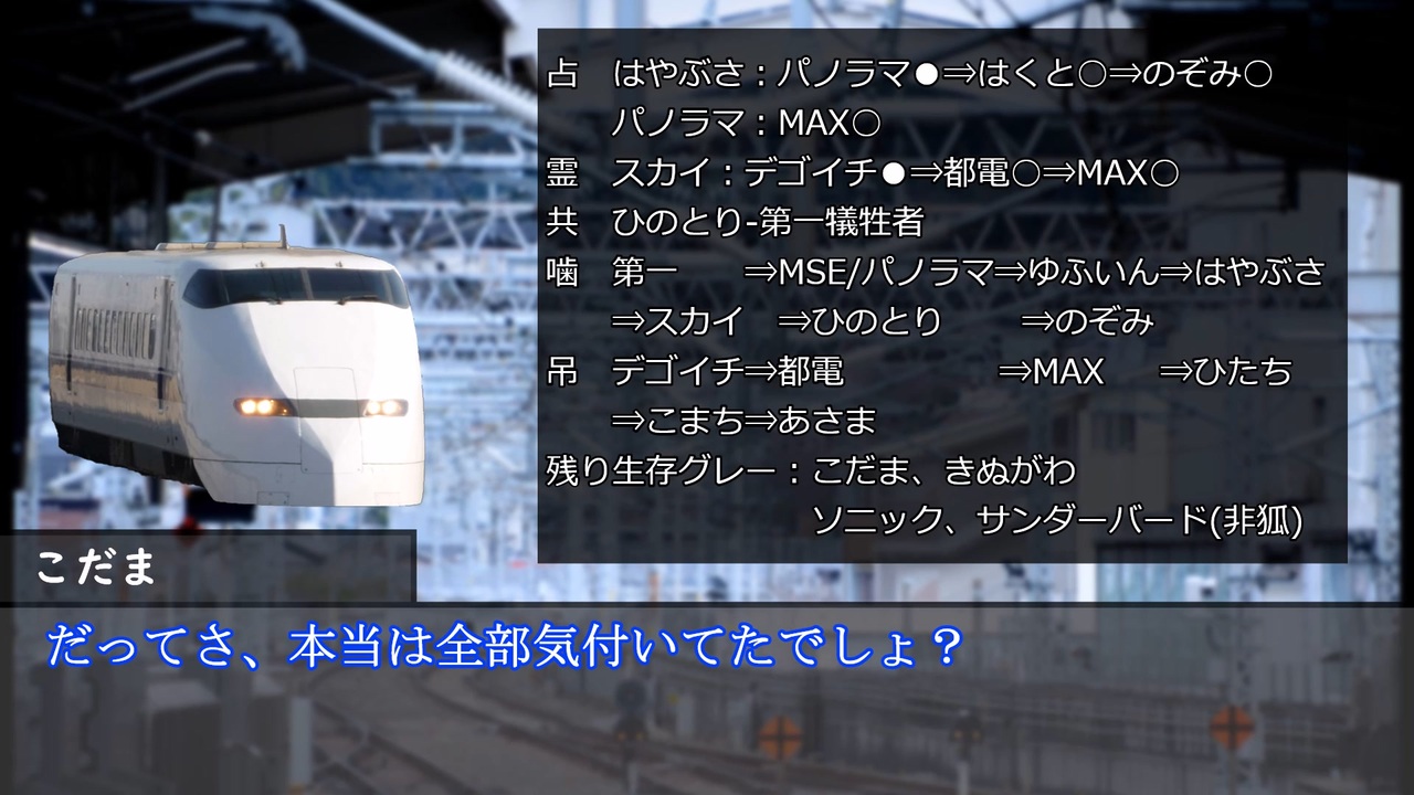 1982年の今日この時刻に東北新幹線の一番列車のあおば200号が出発したそうです。<br>この村の東北新幹線勢(はやぶさ、こまち、MAX)は全滅しているんですけどね…<br><br>19D猫:村6/占1/霊1/狩1/共2/猫1/狼4/信1/狐1/背1<br><br>Twitterで考察して頂ける方は#電車で人狼 を入れて呟いていただけると探しやすいです。<br>2日目⇒<a href="https://www.nicovideo.jp/watch/sm40519472" class="watch">sm40519472</a><br>part6⇒<a href="https://www.nicovideo.jp/watch/sm40645455" class="watch">sm40645455</a> 最終日⇒<a href="https://www.nicovideo.jp/watch/sm40694404" class="watch">sm40694404</a> N700系デビュー15周年の7/1 6:00投稿予定<br><br>電車で人狼!マイリスト <a href="https://www.nicovideo.jp/mylist/72946958" target="_blank" rel="noopener">mylist/72946958</a><br>電車で人狼! 支線編(解説動画) <a href="https://www.nicovideo.jp/mylist/79077747" target="_blank" rel="noopener">mylist/79077747</a><br>人狼動物園マイリスト <a href="https://www.nicovideo.jp/mylist/72986089" target="_blank" rel="noopener">mylist/72986089</a>