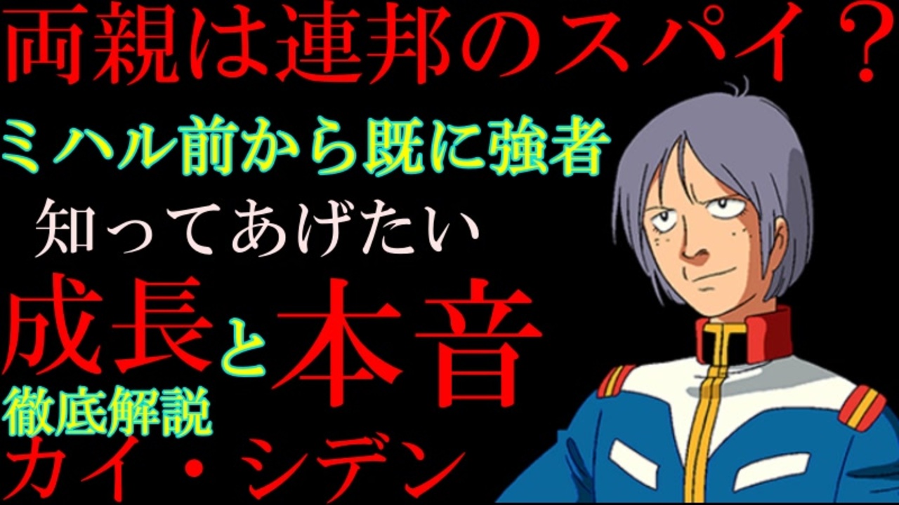 【カイ解説】カイ・シデンは本当に軟弱者なのか。強さと弱さ、本当の思いをを徹底解説【機動戦士ガンダム】<br><br>機動戦士ガンダムにキャラクター、カイ・シデンの解説動画です。<br><br>いくつかの考察を交えながら、なぜそうなったのか、どう決心したのかを解説していきます。<br><br>今回は考察が多めです。<br><br>動画を作りながら、だからカイはシャアに辛辣なんだろうなと思いました。<br>自分が弱くて大したこと無いことを認められたカイと、現実から逃げ続けているシャアと。<br><br><br>質問、などありましたらこちらにも<br><a href="https://twitter.com/@i4S0LHspdgzBTor" target="_blank" rel="noopener nofollow">https://twitter.com/@i4S0LHspdgzBTor</a><br><br>清見元康名義でたいあっぷ、小説家になろう、カクヨムなどに投稿しています。<br>もし良ければ応援お願いしますm(_ _)m<br><a href="https://tieupnovels.com/user/GariGari" target="_blank" rel="noopener nofollow">https://tieupnovels.com/user/GariGari</a><br><a href="https://mypage.syosetu.com/953815/" target="_blank" rel="noopener nofollow">https://mypage.syosetu.com/953815/</a><br><a href="https://kakuyomu.jp/users/GariD/works" target="_blank" rel="noopener nofollow">https://kakuyomu.jp/users/GariD/works</a><br><br>A.I.VOICE:結月ゆかり<br>VOICEVOX:ずんだもん<br><br>いつも広告、コメントありがとうございます。<br>励みになりますm(_ _)m