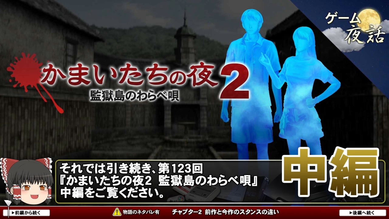 過去動画を宣伝・ギフトして下さった皆さん、ありがとうございましたm(__)m<br>毎回ひとつのゲームを取り上げ、3つのテーマから解説します。<br>【前編】は毎月1日・15日更新、【後編】は制作状況に応じて更新致します。<br><br><strong>原則、「前編」「後編」合わせて毎回約30分を予定しています。<br><br>▼第123回「かまいたちの夜2 監獄島のわらべ唄」</strong><br>前編:<a href="https://www.nicovideo.jp/watch/sm40648343" class="watch">sm40648343</a><br>後編:<a href="https://www.nicovideo.jp/watch/sm40686678" class="watch">sm40686678</a><br><br>■youtubeはこちら <a href="https://youtu.be/KtDRpF7bGQc" target="_blank" rel="noopener nofollow">https://youtu.be/KtDRpF7bGQc</a><br>■ゲーム夜話ツイッター <a href="https://twitter.com/gameyawa" target="_blank" rel="noopener nofollow">https://twitter.com/gameyawa</a>