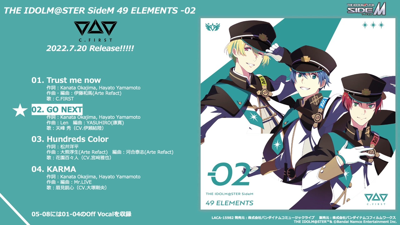 2022.7.20 RELEASE!<br>THE IDOLM@STER SideM 49 ELEMENTS -02 C.FIRST<br>歌:C.FIRST(天峰 秀(CV.伊瀬結陸)、花園百々人 (CV.宮﨑雅也)、眉見鋭心 (CV.大塚剛央))<br>販売価格:¥1,980(10%税込)/¥1,800(税抜)<br>品番:LACA-15982<br>発売元:株式会社バンダイナムコミュージックライブ <br>販売元:株式会社バンダイナムコフィルムワークス<br><br>★Index<br>01. Trust me now <br>作詞:Kanata Okajima, Hayato Yamamoto<br>作曲・編曲:伊藤和馬(Arte Refact)<br>歌:C.FIRST[天峰 秀(CV.伊瀬結陸), 花園百々人(CV.宮﨑雅也), 眉見鋭心(CV.大塚剛央)]<br> <br>02. GO NEXT <br>作詞:Kanata Okajima, Hayato Yamamoto<br>作曲:Len 編曲:YASUHIRO(康寛)<br>歌:天峰 秀(CV.伊瀬結陸)<br> <br>03.Hundreds Color<br>作詞:松井洋平 <br>作曲:大熊淳生(Arte Refact) <br>編曲:河合泰志(Arte Refact)<br>歌:花園百々人(CV.宮﨑雅也)<br> <br>04. KARMA <br>作詞:Kanata Okajima, Hayato Yamamoto<br>作曲・編曲:Mr.LIVE<br>歌:眉見鋭心(CV.大塚剛央)<br> <br>05.Trust me now(Off Vocal)<br>06.GO NEXT(Off Vocal)<br>07. Hundreds Color(Off Vocal)<br>08.KARMA(Off Vocal)<br><br><br>初回生産分にはランダムで1種(全3種)、各アイドルの特製ブロマイドを封入<br>THE IDOLM@STER™& ©Bandai Namco Entertainment Inc.