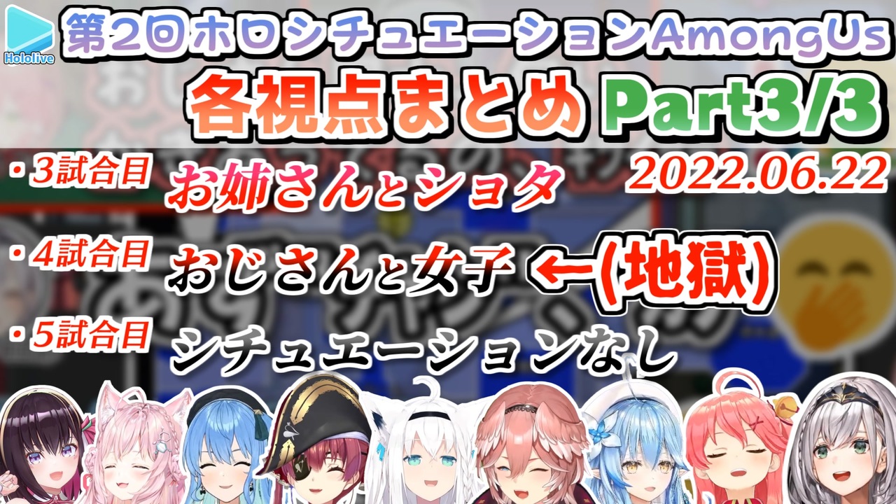 元動画様はこちら<br>【#ホロシチュエーションAmongUs】狐はどう見てもクルーじゃろがい!【白上フブキ視点】<br><a href="https://youtu.be/5nWtGqHmqwo" target="_blank" rel="noopener nofollow">https://youtu.be/5nWtGqHmqwo</a><br><br>【ホロシチュエーションAmongUs】むがいな生き物代表【ホロライブ/さくらみこ】<br><a href="https://youtu.be/Nc-52URVuoU" target="_blank" rel="noopener nofollow">https://youtu.be/Nc-52URVuoU</a><br><br>【ホロシチュエーションAmongUs】まずはインポスターになれるかどうか【ホロライブ / 星街すいせい 】<br><a href="https://youtu.be/I-AFsmILkZY" target="_blank" rel="noopener nofollow">https://youtu.be/I-AFsmILkZY</a><br><br>【ホロシチュエーションAmongUs】団長!単独行動はやめろ!4ぬぞ!【白銀ノエル/ホロライブ】<br><a href="https://youtu.be/EbKuuU0SyDU" target="_blank" rel="noopener nofollow">https://youtu.be/EbKuuU0SyDU</a><br><br>【ホロシチュエーションAmongUs】白確ボンバー【ホロライブ/宝鐘マリン】<br><a href="https://youtu.be/D26t1ZyZlzk" target="_blank" rel="noopener nofollow">https://youtu.be/D26t1ZyZlzk</a><br><br>【ホロシチュエーションAmongUs】パッションで乗り切る!!!!【雪花ラミィ/ホロライブ】<br><a href="https://youtu.be/M7CVFLh3vjs" target="_blank" rel="noopener nofollow">https://youtu.be/M7CVFLh3vjs</a><br><br>【ホロシチュエーションAmongUs】ホロアモアス初参戦!【ホロライブ / AZKi】<br><a href="https://youtu.be/ZiWm3MtODQg" target="_blank" rel="noopener nofollow">https://youtu.be/ZiWm3MtODQg</a><br><br>【ホロシチュエーションAmongUs】なりきることは得意です。【鷹嶺ルイ/ホロライブ】<br><a href="https://youtu.be/k0BwBQB9bg8" target="_blank" rel="noopener nofollow">https://youtu.be/k0BwBQB9bg8</a><br><br>【ホロシチュエーションAmongUs】インポスターになって食べちゃうぞ【博衣こより/ホロライブ】<br><a href="https://youtu.be/xt3GLpc8T6o" target="_blank" rel="noopener nofollow">https://youtu.be/xt3GLpc8T6o</a><br /><span style="color: #b7b7b7; font-size: 10px;">ホロライブ切り抜き/なめたけ <a href="https://t.co/CBwJLnYR2c" target="_blank" rel="noopener nofollow">https://t.co/CBwJLnYR2c</a></span>