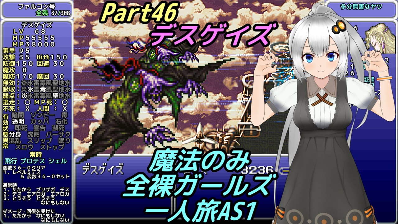 セリフもイベントもない竜王がいるらしい<br><br>・次回 … Part47 <a href="https://www.nicovideo.jp/watch/sm40746651" class="watch">sm40746651</a><br>・前回 … Part45 <a href="https://www.nicovideo.jp/watch/sm40553466" class="watch">sm40553466</a><br><br>・Youtube版 … <a href="https://youtu.be/h6rK2p_Cw7Q" target="_blank" rel="noopener nofollow">https://youtu.be/h6rK2p_Cw7Q</a><br>・字幕のみ … <a href="https://youtu.be/1RSjUcyc4Jo" target="_blank" rel="noopener nofollow">https://youtu.be/1RSjUcyc4Jo</a><br><br>【縛り内容】<br>1、魔法のみ<br>2、全裸(魔石はあり)<br>3、ガールズ<br>4、一人旅<br>5、アクティブ バトルスピード1 メッセージスピード1 詳細:<a href="https://www.nicovideo.jp/watch/sm34595412" class="watch">sm34595412</a><br>6、逃げられない!!表示の連射禁止<br>7、ボスの即死は禁止<br>8、宝物は全て集める<br>9、不具合やバグは不可<br>10、可能な限り低レベル<br>11、コマンド短縮やカーソル記憶しない<br>12、セーブ可能な場所でのみアイテム可<br>13、一部ストーリー上の編成でやむを得ない場合は最低限<br /><br>ふよふよしているの<br>絵:横沢さわらさん VOICEVOX:WhiteCUL<br><br>【シリーズ】<br>くうねるきゃんぷ … <a href="https://www.nicovideo.jp/series/516069" target="_blank" rel="noopener">series/516069</a><br>お写んぽ! … <a href="https://www.nicovideo.jp/series/435756" target="_blank" rel="noopener">series/435756</a><br>様子がおかしい! … <a href="https://www.nicovideo.jp/series/418875" target="_blank" rel="noopener">series/418875</a><br>FF7 魔法マテリアのみ初期防具ガールズ一人旅ASM … <a href="https://www.nicovideo.jp/series/438696" target="_blank" rel="noopener">series/438696</a><br>きんかつ!V-STROM1050XT … <a href="https://www.nicovideo.jp/series/144466" target="_blank" rel="noopener">series/144466</a><br>FF6 魔法のみ全裸ガールズ一人旅AS1 … <a href="https://www.nicovideo.jp/series/9438" target="_blank" rel="noopener">series/9438</a><br>おバイク!GLADIUS400 ABS … <a href="https://www.nicovideo.jp/series/68579" target="_blank" rel="noopener">series/68579</a><br>FF5 魔法のみ全裸一人旅AS1 … <a href="https://www.nicovideo.jp/series/9432" target="_blank" rel="noopener">series/9432</a><br>DQ3 呪文のみ全裸一人旅 … <a href="https://www.nicovideo.jp/series/9416" target="_blank" rel="noopener">series/9416</a><br>DQ2 ムーンブルクの王女一人旅 … <a href="https://www.nicovideo.jp/series/9414" target="_blank" rel="noopener">series/9414</a><br>DQ1 全裸 … <a href="https://www.nicovideo.jp/series/9412" target="_blank" rel="noopener">series/9412</a><br>FE 紋章の謎 天馬騎士単騎 第2部 英雄戦争 … <a href="https://www.nicovideo.jp/series/9404" target="_blank" rel="noopener">series/9404</a><br>FE 紋章の謎 天馬騎士単騎 第1部 暗黒戦争 … <a href="https://www.nicovideo.jp/series/9401" target="_blank" rel="noopener">series/9401</a><br>聖剣2 全裸プリム一人旅 武器Lv1など … <a href="https://www.nicovideo.jp/series/9396" target="_blank" rel="noopener">series/9396</a><br>ロマサガ2 魔術士不得意武器のみ … <a href="https://www.nicovideo.jp/series/9388" target="_blank" rel="noopener">series/9388</a><br>ロマサガ1 術法のみ一人旅で各イベント攻略 … <a href="https://www.nicovideo.jp/series/9386" target="_blank" rel="noopener">series/9386</a><br><br>SNSとか色々なリンク … <a href="https://lit.link/Unaa" target="_blank" rel="noopener nofollow">https://lit.link/Unaa</a>