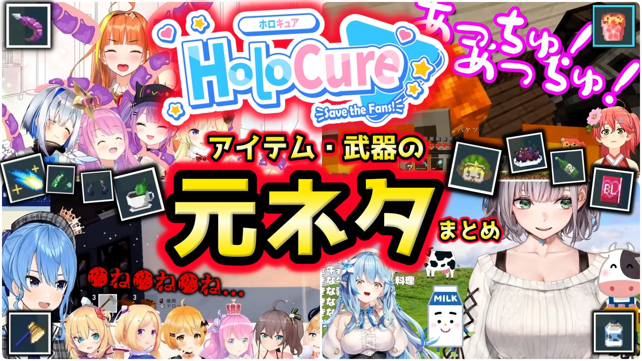 ホロライブが元ネタのゲームHoloCure(ホロキュア)に登場するアイテムの元ネタまとめです<br>◆HoloCure DL はコチラ→<a href="https://kay-yu.itch.io/holocure" target="_blank" rel="noopener nofollow">https://kay-yu.itch.io/holocure</a><br>※作者様に未確認の為予想の部分もありますので参考程度に楽しんでいただけると幸いです<br>(全アイテムではなく私が調べられた分のみの構成です)<br><br>◆ホロライブ公式YouTube→<a href="https://www.youtube.com/channel/UCJFZiqLMntJufDCHc6bQixg" target="_blank" rel="noopener nofollow">https://www.youtube.com/channel/UCJFZiqLMntJufDCHc6bQixg</a><br><br>文字数制限のため元動画はYouTube版にて<br><a href="https://youtu.be/Wf-2H_OnV9k" target="_blank" rel="noopener nofollow">https://youtu.be/Wf-2H_OnV9k</a><br><br>#ホロライブ切り抜き<br><br><span style="color: #b7b7b7;">▷</span><span style="color: #b7b7b7; font-size: 10px;">Vつべの助かる切り抜き(YouTube)→<a href="http://www.youtube.com/channel/UCTk7oeLeSCOO4Kb14-pHWYA" target="_blank" rel="noopener nofollow">http://www.youtube.com/channel/UCTk7oeLeSCOO4Kb14-pHWYA</a></span>