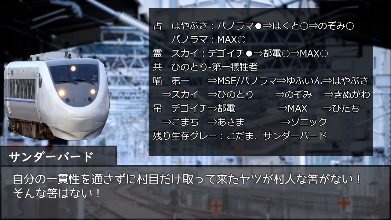 N700系新幹線デビュー15周年!<br>そして山形新幹線開業30周年!<br>それに合わせた最終日投稿です。<br><br>19D猫:村6/占1/霊1/狩1/共2/猫1/狼4/信1/狐1/背1<br><br>議論BGM後半:<a href="https://www.nicovideo.jp/watch/sm40663745" class="watch">sm40663745</a><br>Twitterで考察して頂ける方は#電車で人狼 を入れて呟いていただけると探しやすいです。<br>2日目⇒<a href="https://www.nicovideo.jp/watch/sm40519472" class="watch">sm40519472</a><br>part7⇒<a href="https://www.nicovideo.jp/watch/sm40663745" class="watch">sm40663745</a> 感想戦⇒<a href="https://www.nicovideo.jp/watch/sm40725702" class="watch">sm40725702</a><br><br>電車で人狼!マイリスト <a href="https://www.nicovideo.jp/mylist/72946958" target="_blank" rel="noopener">mylist/72946958</a><br>電車で人狼! 支線編(解説動画) <a href="https://www.nicovideo.jp/mylist/79077747" target="_blank" rel="noopener">mylist/79077747</a><br>人狼動物園マイリスト <a href="https://www.nicovideo.jp/mylist/72986089" target="_blank" rel="noopener">mylist/72986089</a>