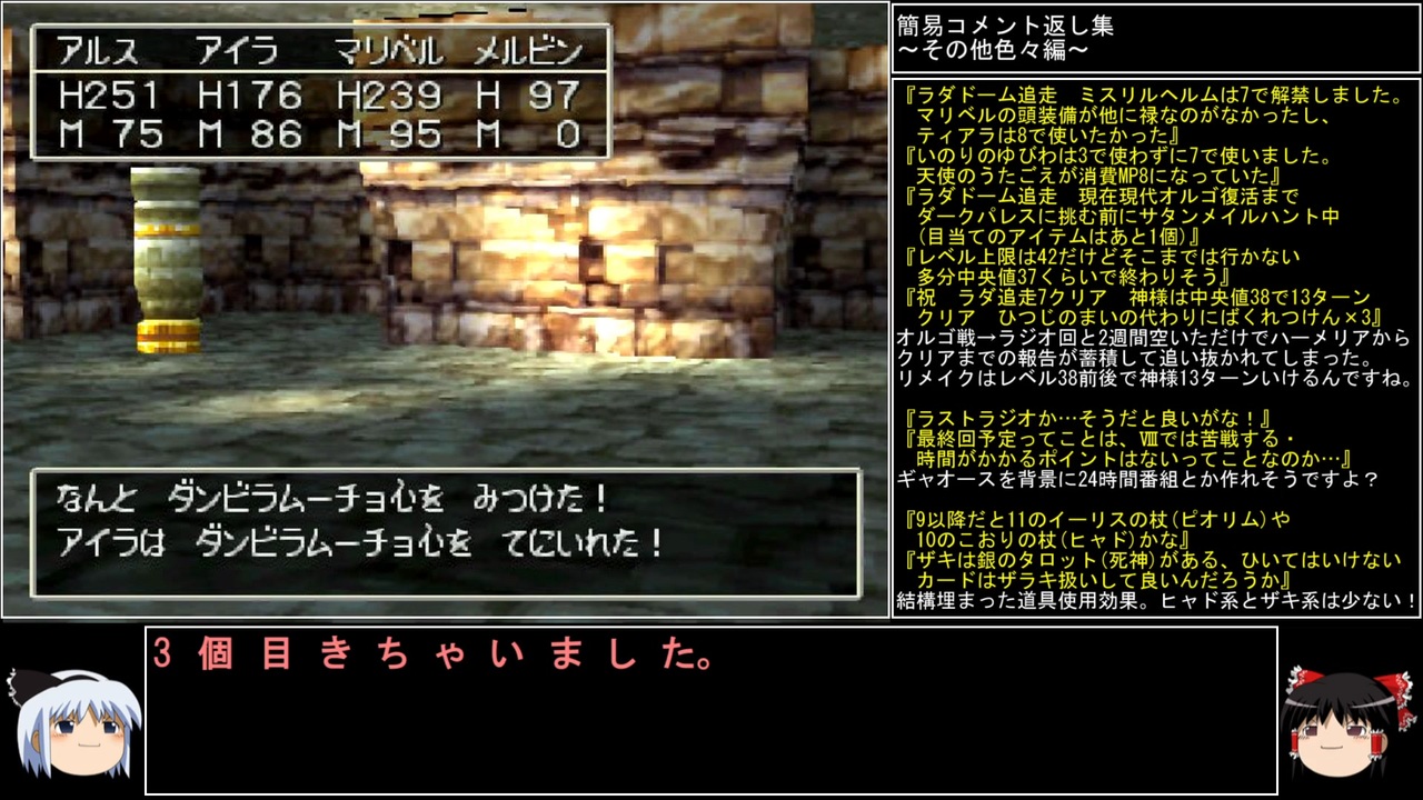 ドラクエ5でのキラーマ(1/1024)に続いて、逆物欲センサーが発動。<br>ここで無駄に運がいいと、ギャオースのしっぷうのバンダナ回収が怖くなってくる……。<br><br>前→<a href="https://www.nicovideo.jp/watch/sm40636013" class="watch">sm40636013</a> 次→<a href="https://www.nicovideo.jp/watch/sm40738107" class="watch">sm40738107</a><br><br>YouTube版→<a href="https://youtu.be/s_u4w6vQI5Y" target="_blank" rel="noopener nofollow">https://youtu.be/s_u4w6vQI5Y</a><br><br><br>※動画の大きさが変わる方は、お手数ですが設定→画質を自動から〇pに変えると解決します。<br>※一部機種は互換機を使用してのプレイとなります。<br><br>縛りルール(不明点はシリーズのQ&Aを参照)<br>①使った武器・防具・装飾品・道具・呪文・特技・一部特殊施設(メダル王・カジノ・移民の町)・職業(3,6,7)・仲間モンスター(4,5,6,8+7の職業)は次以降のシリーズで使用禁止。<br>(NPCキャラが使用した装備や呪文を含む。売却及び錬金素材としても使用扱い)<br><br>②裏技・バグ技の禁止。<br><br>③逃走禁止&戦闘終了時は全員生存。<br><br>④レベルを上げ過ぎない。<br>ダンジョンやボスは公式ガイドブックに記載されたレベル+3まで。<br>ラスボスは全ての呪文を習得するレベル+3程度までに収める。<br><br>⑤裏ボスも規定回数、規定ターン以内に倒す。<br>(6の裏ダンジョン突入時のみ、条件を満たすため①の職業を解禁)<br><br>(おまけ)<br>宝は可能なものに限り全回収。<br>5と6は同一モンスターの仲間不可。<br>回避可能なボスも全て倒す。<br><br><br>この動画で利用している株式会社スクウェア・エニックスを代表とする共同著作者が権利を所有する著作物及びスギヤマ工房有限会社が権利を所有する楽曲の転載・配布は禁止いたします。<br>(C) ARMOR PROJECT/BIRD STUDIO/SQUARE ENIX All Rights Reserved.<br>(C) SUGIYAMA KOBO (P) SUGIYAMA KOBO<br><br>AquesTalk2ライセンスID:AQTK2WINUSR23122185<br /><br><br>❤いいねを押していただけるとモチベーションと投稿速度が上がるので宜しくお願い致します!<br><br>作者ツイッター→ <a href="https://twitter.com/nig0117" target="_blank" rel="noopener nofollow">https://twitter.com/nig0117</a><br>PIXIV FANBOX→ <a href="https://sutanokeiji.fanbox.cc/" target="_blank" rel="noopener nofollow">https://sutanokeiji.fanbox.cc/</a><br><br>( 以前はWEB小説書いてました→ <a href="https://kakuyomu.jp/works/1177354054884910267" target="_blank" rel="noopener nofollow">https://kakuyomu.jp/works/1177354054884910267</a> )