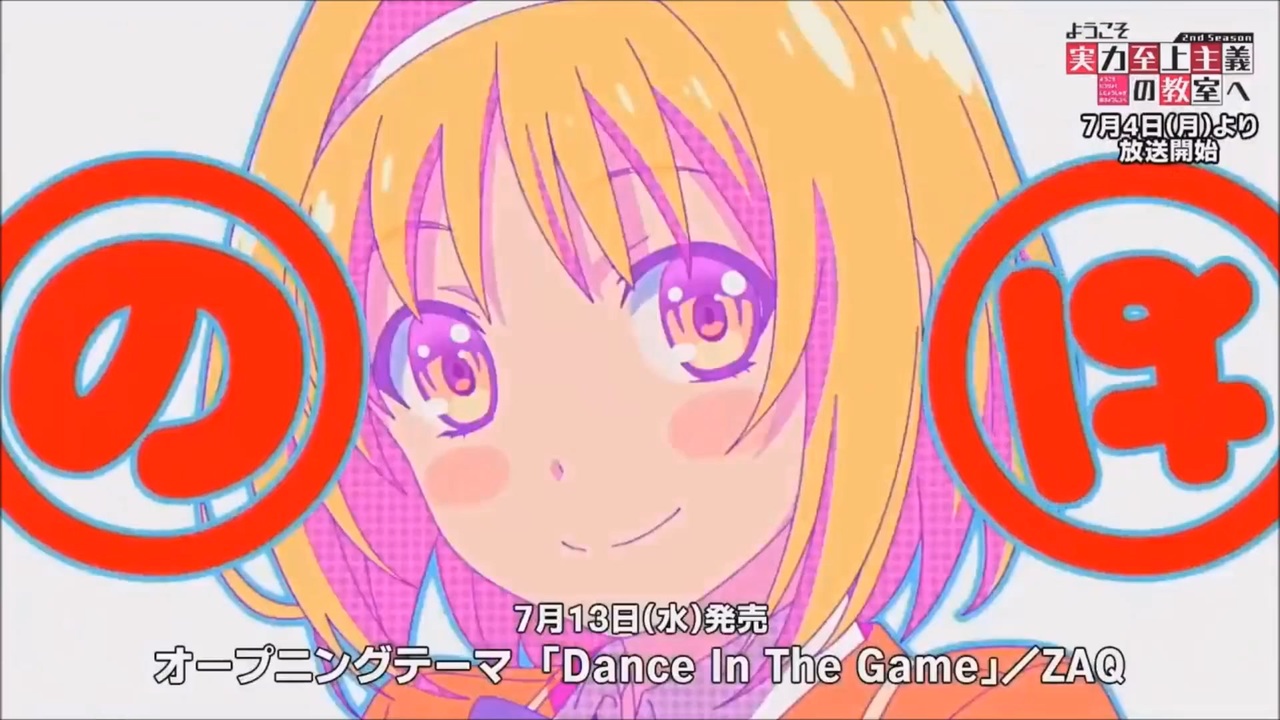 ◢◤ようこそ実力至上主義の教室へ 2nd Season◢◤<br>【キャスト】<br>綾小路清隆:千葉翔也<br>龍園 翔:水中雅章<br>堀北鈴音:鬼頭明里<br>軽井沢 恵:竹達彩奈<br>櫛田桔梗:久保ユリカ<br>平田洋介:逢坂良太<br>佐倉愛理:M・A・O<br>坂柳有栖:日高里菜<br>葛城康平:日野 聡<br>一之瀬帆波:東山奈央<br>伊吹 澪:小松未可子<br>堀北 学:梅原裕一郎<br>橘 茜:小原好美<br>茶柱佐枝:佐藤利奈<br><br>【主題歌アーティスト】<br>オープニングテーマ:「Dance In The Game」ZAQ<br>エンディングテーマ:「人芝居」渕上 舞<br><br>【スタッフ】<br>原作:衣笠彰梧(MF文庫J『ようこそ実力至上主義の教室へ』/KADOKAWA刊)<br>キャラクター原案:トモセシュンサク<br>総監督:岸 誠二 × 橋本裕之<br>監督:仁昌寺義人<br>シリーズ構成:風埜隼人<br>キャラクターデザイン:森田和明<br>音楽:横山 克、橋口佳奈<br>音響監督:飯田里樹<br>アニメーション制作:Lerche<br>製作:ようこそ実力至上主義の教室へ2製作委員会<br><br>【SNS・HP】<br>公式Twitter:<a href="https://twitter.com/youkosozitsu" target="_blank" rel="noopener nofollow">https://twitter.com/youkosozitsu</a><br>アニメ公式サイト:<a href="http://you-zitsu.com/" target="_blank" rel="noopener nofollow">http://you-zitsu.com/</a><br>原作サイト:<a href="https://youkosozitsuryoku-2nd.com/" target="_blank" rel="noopener nofollow">https://youkosozitsuryoku-2nd.com/</a><br><br>