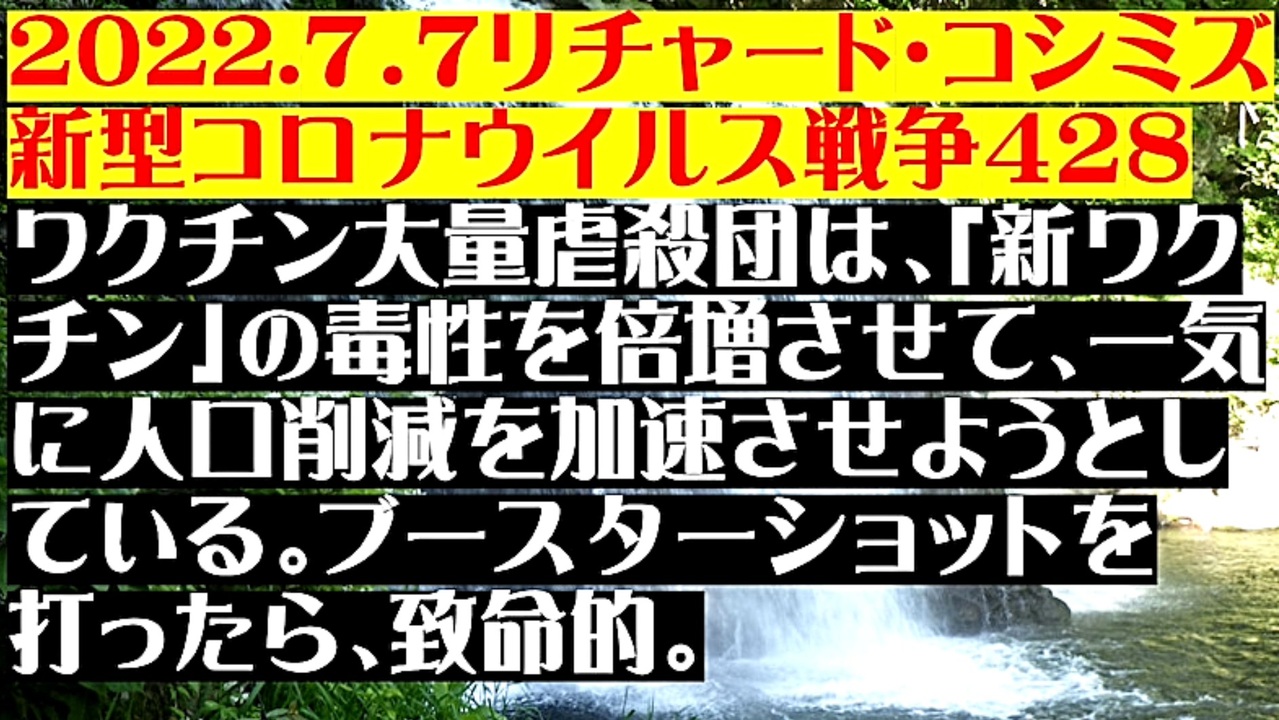 <span style="color: #cc4125;"><strong>「 テーマ:新型コロナウイルス戦争 428」</strong></span><br><br><span style="color: #ff0000;"><strong>「『 ワクチン大量虐殺団 』は、『 新ワクチンの毒性 』を倍増させて、『 一気に、人口削減を加速させよう 』<br> としている。『 ブースターショット 』を打ったら、致命的 」</strong></span><br><br><strong>*「フォロー」・「ニコニ広告」・「いいね!」・「情報拡散」等、ご協力下さい。 リチャード・コシミズ</strong><br><br>◐DEEP STATE裏社会は、「現行ワクチンがオミクロン株には無効」だとして、毒性の強い<br> 「新ワクチン」を打たせようと企んでいる。大量虐殺が始まる。<br><br>◐武漢株ワクチンの接種で、オミクロン変異株に感染しやすくなり、感染者が増えている。<br> よって、「ワクチン接種の強化」は逆効果。<br><br>◐ワクチンを打ってしまっていても、イベルメクチン服用で、悪影響は排除できるようである。<br><br>◐国民の8割が毒ワクチンを打つ情弱国家では、「勘違いに基づく投票」しか行われない。<br> よって、自民党・公明党が勝利する。<br><br>◐コロナ・ウクライナから「世界の真相」が知られて、人類が覚醒した後、選挙は正常化される。<br><br><span style="color: #38761d;">◆</span><span style="color: #38761d;"><strong>リチャード・コシミズ 公式 ブログ</strong></span><br> <a href="https://ameblo.jp/richardneversurrender/" target="_blank" rel="noopener nofollow">https://ameblo.jp/richardneversurrender/</a><br><br><span style="color: #38761d;">◆</span><span style="color: #38761d;"><strong>リチャード・コシミズ 公式 ホームページ<br> </strong></span><a href="http://richardkoshimizu.boo.jp/" target="_blank" rel="noopener nofollow">http://richardkoshimizu.boo.jp/</a><br><br><span style="color: #38761d;">◆</span><span style="color: #38761d;"><strong>リチャード・コシミズ 講演会 公式 動画ギャラリー</strong></span><br> <a href="http://www.t-sskk.com/richardkoshimizu/video-gallery/index.html" target="_blank" rel="noopener nofollow">http://www.t-sskk.com/richardkoshimizu/video-gallery/index.html</a><br>
