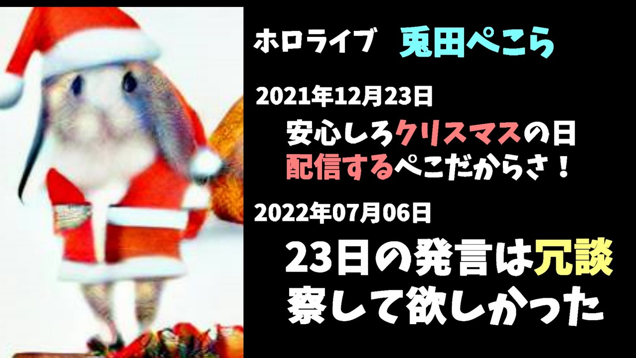 2022年7月6日、ホロライブ所属のVTuberの兎田ぺこらさんが去年クリスマスにおきたいわゆる冷めたチキン騒動について語ったとして話題になっているのですが・・・<br><br>引用<br><a href="https://twitter.com/usadapekora/status/1544612075821232133" target="_blank" rel="noopener nofollow">https://twitter.com/usadapekora/status/1544612075821232133</a><br><br>今後の 製作予定動画<br>にじさんじのラトナ、奈羅花、天宮らASMRを非公開に<br>にじさんじローレン、配信にて不適切発言を謝罪<br>Cottage、運営体制変更<br>元にじさんじ運営幹部いわなが社長、新しい箱を立ち上げる<br>【悲報】鳴神裁「裁判をすっ飛ばして逮捕はあり得ない」<br>にじさんじ引退者まとめPart.3<br>【悲報】にじさんじライバー、一本満足バーを一度に二本食べてしまう<br><br>Youtube <a href="https://www.youtube.com/channel/UCzYQPx8MeE99DUkW9Y_txJw" target="_blank" rel="noopener nofollow">https://www.youtube.com/channel/UCzYQPx8MeE99DUkW9Y_txJw</a><br>twitter <a href="https://twitter.com/V_Virgin_Mary" target="_blank" rel="noopener nofollow">https://twitter.com/V_Virgin_Mary</a><br><br>使用素材<br>高品質なフリー動画素材 - Pixabay <a href="https://pixabay.com/ja/videos" target="_blank" rel="noopener nofollow">https://pixabay.com/ja/videos</a>