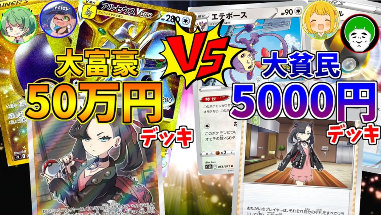大富豪50万円デッキVS大貧民5000円デッキの値段差100倍極限バトル!!<br><br>※最後の基本エネは21枚全部で300円です。(ポケセンで8枚入で100円)<br><br>※第1試合、決勝、ビリ決定戦は他3人のYoutubeチャンネルにて投稿。<br><br>次回→<a href="https://www.nicovideo.jp/watch/sm41102147" class="watch">sm41102147</a><br><br>【ポケカマイリス】<a href="https://www.nicovideo.jp/mylist/63573601" target="_blank" rel="noopener">mylist/63573601</a><br><span style="color: #000000;">【チャンネル】</span><span style="color: #006699; font-size: 14px;"><a href="https://ch.nicovideo.jp/ainosensi" target="_blank" rel="noopener">ch.nicovideo.jp/ainosensi</a></span><br><span style="color: #000000; font-size: 14px;">【その他投稿作品】</span><span style="color: #006699; font-size: 14px;"><a href="https://www.nicovideo.jp/mylist/34427287" target="_blank" rel="noopener">mylist/34427287</a></span><span style="color: #000000; font-size: 14px;"> 【Twitter】@ainosensi2</span><br><span style="color: #14171a; font-size: 14px;">【YOUTUBE】</span><span style="color: #006699; font-size: 14px;"><a href="http://goo.gl/OMphlA" target="_blank" rel="noopener nofollow">http://goo.gl/OMphlA</a></span>