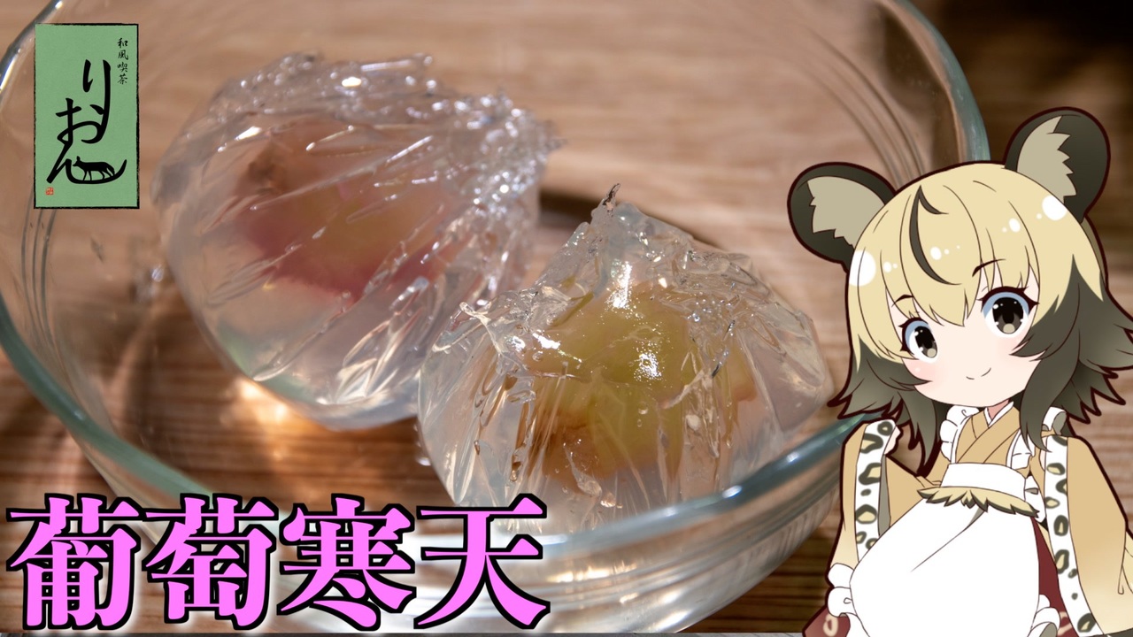 手作り和菓子19回目は「葡萄寒天」です。<br><br>容器に葡萄を並べて寒天を流すタイプでももちろんいいですが、<br>今回は、ちょっと工夫して雫型を目指して見ました。<br>涼しさを感じる夏のお菓子ですね。<br>ちなみにあの道具を料理に使ったのは初めてです^^<br><br>■材料<br>・種無し葡萄(巨峰)<br>・寒天パウダー 2g<br>・水 110mL<br>・グラニュー糖 45g<br><br>・耐熱フィルム(またはラップ)<br><br>twitter:@lycaon_kitchen<br>youtube:<a href="https://youtu.be/xOvnksGr3Rk" target="_blank" rel="noopener nofollow">https://youtu.be/xOvnksGr3Rk</a><br><br>りおんの和風喫茶:<a href="https://www.nicovideo.jp/series/77190" target="_blank" rel="noopener">series/77190</a><br>おつかれごはん:<a href="https://www.nicovideo.jp/series/155690" target="_blank" rel="noopener">series/155690</a><br>手作り和菓子でちょっとひとやすみしませんか?:<a href="https://www.nicovideo.jp/series/155691" target="_blank" rel="noopener">series/155691</a><br><br>立ち絵:星華 彩二魔 様<br>イラスト:いらすとや、AWD kitchen<br>音源:DOVA-SYNDROME、ポケットサウンド<br>音声:VOICEROID2 紲星あかり