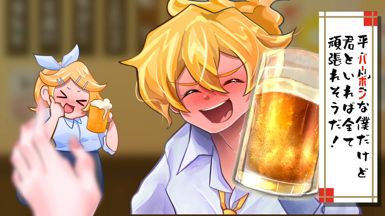 好きなレンくんが現れたら…<br>急いで口で吸え‼︎‼︎<br><br>※この曲は「第1回 IPPUN GRAND PRIX 」参加作品です。<br><br>【曲に関して】<br>・絵みにまさま [@32machann]<br>・曲、動画モミアゲヲ<br>・歌鏡音リン、レン<br><br>【歌詞】※酩酊版<br>歩こう 歩こう 僕らのペースで<br>アテもない僕に つまみ出したくなるかも知れないけど<br>アルコール アルコール 汗でピッチャーピッチャーになるまで<br>へべれけの運命 それもまた泥酔ってね〜い<br>アサヒ ビール 晩 君の笑顔(マッコリ)<br>焼酎 考えているだけで僕は ハッピー!ハッピー?いやホッピーさ!<br>平々バーボンな僕だけど 君といれば全てカンパリソーダ<br>スコッチ照れるけど言わせてくれよ…<br>君のことが だ、ウィスキーだ!<br><br>【イベントに関して】<br>・主催 Shuさま[@shu_horiike]<br>・副主催 appyさま[@appy_7]<br> 藤原ハガネさま[@fujitetsu8]<br> rukakuさま[@mikuphile]<br><br>・公式ニコニコ動画<br><a href="https://www.nicovideo.jp/user/122637647" target="_blank" rel="noopener nofollow">https://www.nicovideo.jp/user/122637647</a><br><br>・公式Twitter<br><a href="https://twitter.com/ippun_grandprix" target="_blank" rel="noopener nofollow">https://twitter.com/ippun_grandprix</a><br>(質問・お問い合わせ等はこちらのDMにお願いいたします)<br><br>・Twitter公式ハッシュタグ<br>#IPPUN_GP<br><br>
