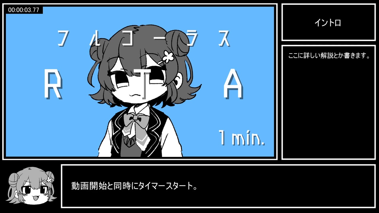 クールでミステリアスなボカロPなので初投稿です。<br>レギュレーションは「J-POP構成 達成率100%」を採用しました。<br><br>多分これが一番早いと思います。<br><br>※このRTAはフィクションです。<br>※IPPUN GRAND PRIX参加作品です。<br><br>YouTube版<br><a href="https://youtu.be/zrnfG84PRsA" target="_blank" rel="noopener nofollow">https://youtu.be/zrnfG84PRsA</a><br><br>歌唱(被害者):小春六花<br><br>Player:小春六花<br><br>解説:ゆっくりこはるり<br><br>曲,詞,動画,Mix,Mastering(犯人):吉田夜世<br>twitter → <a href="https://twitter.com/otgys" target="_blank" rel="noopener nofollow">https://twitter.com/otgys</a><br>mylist → <a href="https://www.nicovideo.jp/mylist/27990412" target="_blank" rel="noopener">mylist/27990412</a><br>contact → yasson440@gmail.com<br><br>絵(共犯):シシア<br>twitter → <a href="https://twitter.com/sisikemo123" target="_blank" rel="noopener nofollow">https://twitter.com/sisikemo123</a><br><br>off vocal・二次創作等利用規約<br><a href="https://drive.google.com/drive/folders/1JX8zD50xSR12UDdCYsTI1Pjchnjovh-v?usp=sharing" target="_blank" rel="noopener nofollow">https://drive.google.com/drive/folders/1JX8zD50xSR12UDdCYsTI1Pjchnjovh-v?usp=sharing</a><br>※キーを変更したい場合は、ドラムとそれ以外に分かれた音源をDLし、ドラム以外のキーのみ変更して下さい。<br><br>『フルコーラスRTA 1min.』<br>さぁ始まりましたこの宴<br>早々目指そうか台風の目<br>欲張って全部詰め込んで<br>チャートを組み上げた最強のGame<br><br>完全体の1min.(ワンミニット)<br>これが最速のFascinate<br>心・技・体のHybrid<br>高揚感でブチ上げろ!<br><br>さぁチャートなぞって中盤へ<br>少々緊張見える両手<br>失敗もきっとコンテンツで?<br>とか言ってられない更新Play<br><br>最先端の1min.(ワンミニット)<br>操作超えていくdpi(解像度)<br>瞬間のfps(フレームレート)<br>交感神経従えよ!<br><br>最終戦舞台手前の<br>緊張感を突き破れ!<br>大正解の1min.(ワンミニット)<br>これが一番早いだろうね?<br><br>※無断転載禁止/DO NOT REPOST