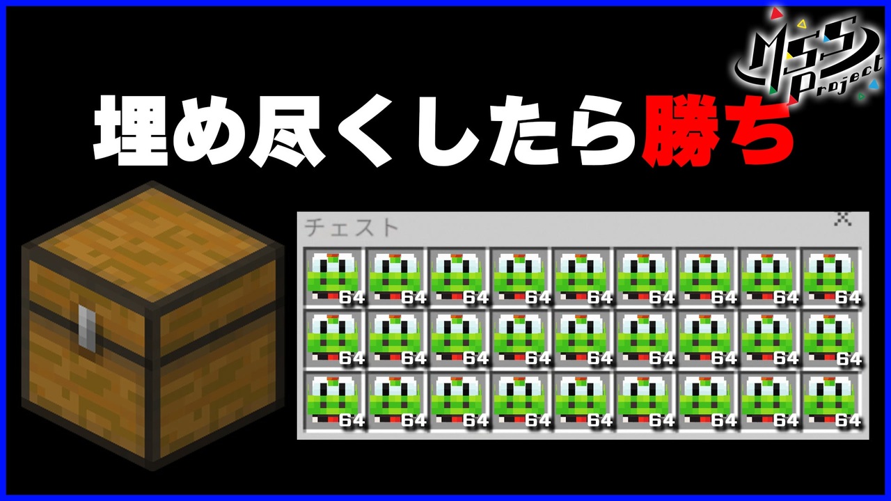 今回はBOX内を64スタックのアイテムで埋め尽くしたら勝ち!<br>スタックバトルロイヤルをしてみました!<br><br>★KIKKUN-MK-Ⅱ→ヨッシー。特攻隊長。<br>★FB777→黒スーツ。真面目系クズ。<br>★あろまほっと→マスターチーフ。偽癒し系。<br>★eoheoh→宇宙人。天然要因。<br><br>高画質はこちら→<a href="https://youtu.be/MhnaxdC-8lY" target="_blank" rel="noopener nofollow">https://youtu.be/MhnaxdC-8lY</a><br><br>前回→<a href="https://www.nicovideo.jp/watch/sm40729911" class="watch">sm40729911</a> 次回→<a href="https://www.nicovideo.jp/watch/sm40806054" class="watch">sm40806054</a><br>マイクラマイリス→<a href="https://www.nicovideo.jp/mylist/34003718" target="_blank" rel="noopener">mylist/34003718</a><br><br />▼Limited Abyss History 2026年MSSP音楽ライブ情報も!<br>16周年グッズや16周年のMSSPの最新情報一覧はこちらから!<br>MSSPオフィシャルサイト<br><a href="https://mssp-web.com/" target="_blank" rel="noopener nofollow">https://mssp-web.com/</a><br><br>▼MSSP最新ミニアルバム『サンダーボルト』リリース中!!<br>MV <a href="https://youtu.be/6fNvrd0qMfg" target="_blank" rel="noopener nofollow">https://youtu.be/6fNvrd0qMfg</a><br><a href="https://mssp-web.com/discography/kp7f4ff2ntm/" target="_blank" rel="noopener nofollow">https://mssp-web.com/discography/kp7f4ff2ntm/</a><br><br>▼15年分のMSSP音源&新曲が詰まった超ウルトラベスト盤<br>『M.S.S.Platinum BEST』発売中!オンライン販売はこちら↓<br><a href="https://ipshoten-online.com/products/ipst-0031" target="_blank" rel="noopener nofollow">https://ipshoten-online.com/products/ipst-0031</a><br><br>▼↓↓↓M.S.S Projectの動画の切り抜き動画公開に関しての<br>ガイドラインは此方のブロマガをご覧ください!↓↓↓<br><a href="https://ch.nicovideo.jp/mssp/blomaga/ar2087761" target="_blank" rel="noopener nofollow">https://ch.nicovideo.jp/mssp/blomaga/ar2087761</a><br><br>▼MSSPオフィシャルサイト<br><a href="https://mssp-web.com/" target="_blank" rel="noopener nofollow">https://mssp-web.com/</a><br>▼MSSPライブサイト<br><a href="https://live.mssp-web.com/2025w/" target="_blank" rel="noopener nofollow">https://live.mssp-web.com/2025w/</a><br>▼MSSPグッズショップサイト<br><a href="https://official-goods-store.jp/mssproject/" target="_blank" rel="noopener nofollow">https://official-goods-store.jp/mssproject/</a><br>▼Youtube M.S.S Project ライブ(実写、生放送)<br><a href="https://www.youtube.com/c/NewMSSP" target="_blank" rel="noopener nofollow">https://www.youtube.com/c/NewMSSP</a><br>▼Youtube M.S.S Project ゲーム<br><a href="https://www.youtube.com/@MSSP" target="_blank" rel="noopener nofollow">https://www.youtube.com/@MSSP</a><br>▼ニコニコ動画 M.S.S Projectチャンネル<br><a href="http://ch.nicovideo.jp/mssp/blomaga" target="_blank" rel="noopener nofollow">http://ch.nicovideo.jp/mssp/blomaga</a><br>▼ニコニコM.S.S Project実況動画 <br><a href="http://www.nicovideo.jp/mylist/14610850" target="_blank" rel="noopener nofollow">http://www.nicovideo.jp/mylist/14610850</a>