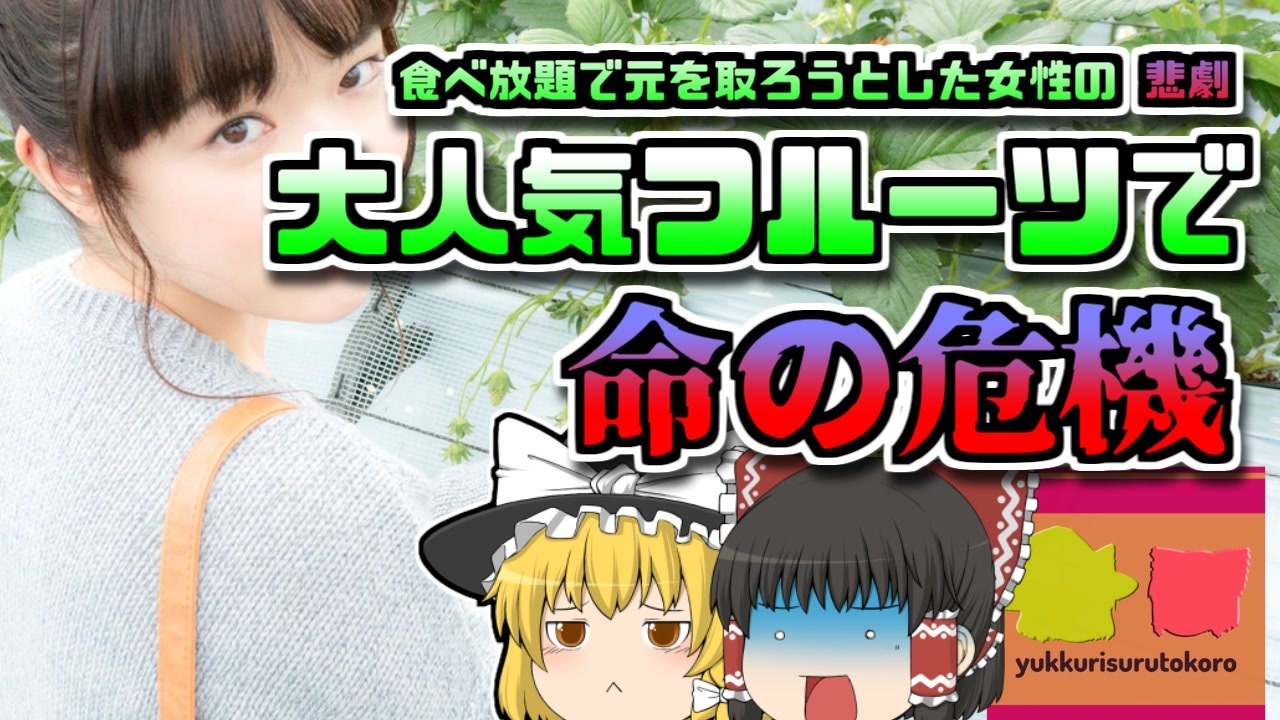 今回紹介するのは、リクエストの中から、<br>「いちご」に関する食中毒事例です。<br>愛知県に暮らす女性「Aさん」はこの日、農家のビニールハウスで行われた「いちご狩り」に参加していました。<br>料金を支払えば、時間無制限でいちごが食べ放題だったため、Aさんは元をとろうと、すさまじいペースでいちごを食べ続けました。<br>開始30分ほどが経過したころ、彼女の体に異変が。<br>開演前にトイレに行っていたAさんでしたが、いちごを食べ始めてすぐ、再び尿意を感じ、外のトイレへ。<br>それから10分もしないうちに、またトイレに行きたくなり、Aさんは一時間ほどの間に何度もトイレとビニールハウスを往復することに。<br>その後、約50個のいちごを食べたところで、満腹になってしまったため、Aさんは帰宅。<br>その直後、彼女は激しい腹痛に見舞われ、トイレで意識を失ってしまいました。<br><br><a href="#" class="seekTime" data-seekTime="00:00" onclick="seekNicoPlayer('#00:00'); return false;">#00:00</a> 冒頭挨拶<br><a href="#" class="seekTime" data-seekTime="00:36" onclick="seekNicoPlayer('#00:36'); return false;">#00:36</a> 視聴上の注意<br><a href="#" class="seekTime" data-seekTime="1:16" onclick="seekNicoPlayer('#1:16'); return false;">#1:16</a> 現地の説明<br><a href="#" class="seekTime" data-seekTime="2:05" onclick="seekNicoPlayer('#2:05'); return false;">#2:05</a> いちご狩りに訪れた「Aさん」<br><a href="#" class="seekTime" data-seekTime="2:58" onclick="seekNicoPlayer('#2:58'); return false;">#2:58</a> 食べまくったいちご<br><a href="#" class="seekTime" data-seekTime="3:24" onclick="seekNicoPlayer('#3:24'); return false;">#3:24</a> 異変<br><a href="#" class="seekTime" data-seekTime="4:21" onclick="seekNicoPlayer('#4:21'); return false;">#4:21</a> 帰ってから激しい腹痛<br><a href="#" class="seekTime" data-seekTime="5:04" onclick="seekNicoPlayer('#5:04'); return false;">#5:04</a> 病院へ<br><a href="#" class="seekTime" data-seekTime="5:32" onclick="seekNicoPlayer('#5:32'); return false;">#5:32</a> 不整脈、カリウム<br><a href="#" class="seekTime" data-seekTime="6:53" onclick="seekNicoPlayer('#6:53'); return false;">#6:53</a> もう一つの異変<br><a href="#" class="seekTime" data-seekTime="7:57" onclick="seekNicoPlayer('#7:57'); return false;">#7:57</a> 脱水症状<br><a href="#" class="seekTime" data-seekTime="9:20" onclick="seekNicoPlayer('#9:20'); return false;">#9:20</a> 食べ放題で元は取れない<br><br><br><br>引用・出展・参考文献<br>健康長寿ネット<br><a href="https://ishort.ink/yM1U" target="_blank" rel="noopener nofollow">https://ishort.ink/yM1U</a><br>MINORASU<br><a href="https://minorasu.basf.co.jp/" target="_blank" rel="noopener nofollow">https://minorasu.basf.co.jp/</a><br>東洋経済オンライン<br><a href="https://ishort.ink/gjuc" target="_blank" rel="noopener nofollow">https://ishort.ink/gjuc</a><br>北海道医療センター<br><a href="https://ishort.ink/wh8u" target="_blank" rel="noopener nofollow">https://ishort.ink/wh8u</a><br>日本赤十字社愛知医療センター<br><a href="https://ishort.ink/oUqR" target="_blank" rel="noopener nofollow">https://ishort.ink/oUqR</a><br>春夏秋凍<br><a href="https://ishort.ink/xLfX" target="_blank" rel="noopener nofollow">https://ishort.ink/xLfX</a><br>大正製薬<br><a href="https://ishort.ink/jtVn" target="_blank" rel="noopener nofollow">https://ishort.ink/jtVn</a><br>その他視聴者提供資料など<br><br><br />※この動画は過去の事件を知り、現在でも同じことが発生する危険性を再認識、関与しないように促すための動画であり、視聴者を扇動、動揺を誘うためのコンテンツではありません。<br><br>ご要望にお応えして、メンバーシップの開設を行いました。<br>下記URLからも登録可能ですので、ご興味がある方は是非ご参加ください。<br><a href="https://www.youtube.com/channel/UCcT5a1J7XJW7CLYI2RKl4pw/join" target="_blank" rel="noopener nofollow">https://www.youtube.com/channel/UCcT5a1J7XJW7CLYI2RKl4pw/join</a><br><br><br>Twitter<br>→<a href="https://twitter.com/yukkurisurutoko" target="_blank" rel="noopener nofollow">https://twitter.com/yukkurisurutoko</a><br><br>取り急ぎ、簡易的にですがマイリストを作りました。<br>【ゆっくり解説】事故・事件関係紹介リスト <br><a href="https://www.nicovideo.jp/mylist/71034319" target="_blank" rel="noopener nofollow">https://www.nicovideo.jp/mylist/71034319</a><br>【ゆっくり解説】放射線系事故<br><a href="https://www.nicovideo.jp/mylist/71034368" target="_blank" rel="noopener nofollow">https://www.nicovideo.jp/mylist/71034368</a><br>【ゆっくり解説】鉄道系事故・事件関連<br><a href="https://www.nicovideo.jp/mylist/71034379" target="_blank" rel="noopener nofollow">https://www.nicovideo.jp/mylist/71034379</a>