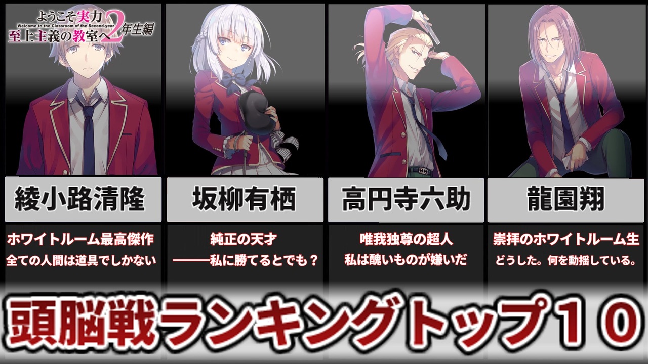 ご視聴ありがとうございます!<br><br>現最新刊2年生編7巻時点での頭脳戦力ランキングです。<br>よければいいね・マイリス・コメントお願いします!<br><br>戦闘能力ランキング<br><a href="https://www.nicovideo.jp/watch/sm40782877" target="_blank" rel="noopener nofollow">https://www.nicovideo.jp/watch/sm40782877</a><br><br>☆チャプター(目次)☆<br><a href="#" class="seekTime" data-seekTime="0:22" onclick="seekNicoPlayer('#0:22'); return false;">#0:22</a> 第10位 ???<br><a href="#" class="seekTime" data-seekTime="3:19" onclick="seekNicoPlayer('#3:19'); return false;">#3:19</a> 第9位 ???<br><a href="#" class="seekTime" data-seekTime="4:42" onclick="seekNicoPlayer('#4:42'); return false;">#4:42</a> 第8位 ???<br><a href="#" class="seekTime" data-seekTime="7:05" onclick="seekNicoPlayer('#7:05'); return false;">#7:05</a> 第7位 ???<br><a href="#" class="seekTime" data-seekTime="10:00" onclick="seekNicoPlayer('#10:00'); return false;">#10:00</a> 第6位 ???<br><a href="#" class="seekTime" data-seekTime="10:49" onclick="seekNicoPlayer('#10:49'); return false;">#10:49</a> 第5位 ???<br><a href="#" class="seekTime" data-seekTime="12:29" onclick="seekNicoPlayer('#12:29'); return false;">#12:29</a> 第4位 ???<br><a href="#" class="seekTime" data-seekTime="14:40" onclick="seekNicoPlayer('#14:40'); return false;">#14:40</a> 第3位 ???<br><a href="#" class="seekTime" data-seekTime="17:22" onclick="seekNicoPlayer('#17:22'); return false;">#17:22</a> 第2位 ???<br><a href="#" class="seekTime" data-seekTime="18:38" onclick="seekNicoPlayer('#18:38'); return false;">#18:38</a> 第1位 ???<br><br>☆ずんだもん立ち絵☆<br>島でドンパチするメイ様<br><a href="https://seiga.nicovideo.jp/seiga/im10894006" target="_blank" rel="noopener nofollow">https://seiga.nicovideo.jp/seiga/im10894006</a><br><br>☆音楽&効果音☆<br>DOVA-SYNDROME<br>騒音のない世界<br>効果音ラボ