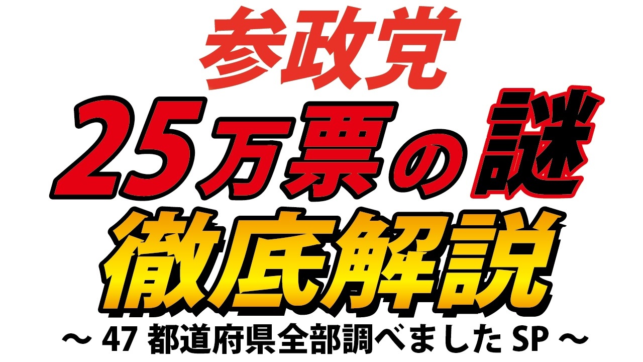 ❑参議院議員選挙結果のデータはこちら(総務省)<br><a href="https://www.soumu.go.jp/senkyo/senkyo_s/data/sangiin26/index.html" target="_blank" rel="noopener nofollow">https://www.soumu.go.jp/senkyo/senkyo_s/data/sangiin26/index.html</a><br><br><br>❑参政党 関連書籍<br>・国民の眠りを覚ます「参政党」<br><a href="https://amzn.to/3yVxS7V" target="_blank" rel="noopener nofollow">https://amzn.to/3yVxS7V</a><br><br>・参政党Q&Aブック 基礎編<br><a href="https://amzn.to/3z1PJv5" target="_blank" rel="noopener nofollow">https://amzn.to/3z1PJv5</a><br><br><br><br>❏藤江の活動を支援していただける方向け<br>【藤江支援口座】のご案内<br>住信SBIネット銀行 ミカン支店(店番号103)<br>口座番号 3107694<br>口座名義 フジエ マサミツ<br><br>=====================================================<br>日本の人口増加を目指す男、藤江です!【メインチャンネル】<br><a href="https://www.youtube.com/c/JINKOUZOUKA/" target="_blank" rel="noopener nofollow">https://www.youtube.com/c/JINKOUZOUKA/</a><br><br>地域と日本の存続のためニ!【藤江2ndチャンネル】<br><a href="https://www.youtube.com/channel/UCfBh4rv5UT7D-qR6KsoZrsA" target="_blank" rel="noopener nofollow">https://www.youtube.com/channel/UCfBh4rv5UT7D-qR6KsoZrsA</a><br><br>今こそ!三千年の底力【藤江3rdチャンネル】<br><a href="https://www.youtube.com/channel/UC5Yrsm8-X8nZj4uKgvE7CBw" target="_blank" rel="noopener nofollow">https://www.youtube.com/channel/UC5Yrsm8-X8nZj4uKgvE7CBw</a><br><br>四海兄弟【藤江4thチャンネル】<br><a href="https://www.youtube.com/channel/UCiyJNO57quj80Ysy7nOABvA" target="_blank" rel="noopener nofollow">https://www.youtube.com/channel/UCiyJNO57quj80Ysy7nOABvA</a><br><br>五穀豊穣【藤江5thチャンネル】<br><a href="https://www.youtube.com/channel/UCptMJCoKYghfew5tDzoEqHQ" target="_blank" rel="noopener nofollow">https://www.youtube.com/channel/UCptMJCoKYghfew5tDzoEqHQ</a><br><br>藤江のTwitter<br><a href="https://twitter.com/JINKOUZOUKA_jp" target="_blank" rel="noopener nofollow">https://twitter.com/JINKOUZOUKA_jp</a><br><br>藤江のニコニコ動画<br><a href="https://www.nicovideo.jp/user/5457748" target="_blank" rel="noopener nofollow">https://www.nicovideo.jp/user/5457748</a>