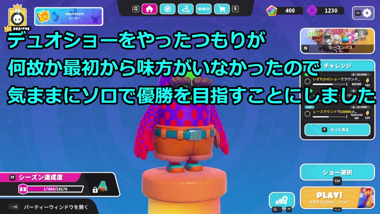 Fall Guys: Ultimate Knockoutをプレイ<br>公式サイト: <a href="https://www.fallguys.com/ja" target="_blank" rel="noopener nofollow">https://www.fallguys.com/ja</a><br><br><a href="https://www.nicovideo.jp/watch/sm40783722" class="watch">sm40783722</a>←前 次→<a href="https://www.nicovideo.jp/watch/sm40813451" class="watch">sm40813451</a><br>このシリーズとか <a href="https://www.nicovideo.jp/mylist/40533731" target="_blank" rel="noopener">mylist/40533731</a><br>シリーズpart1 <a href="https://www.nicovideo.jp/mylist/29516244" target="_blank" rel="noopener">mylist/29516244</a><br>youtube <a href="https://www.youtube.com/channel/UCojRF-b4D0R5JFZYa9iJfKw" target="_blank" rel="noopener nofollow">https://www.youtube.com/channel/UCojRF-b4D0R5JFZYa9iJfKw</a><br><br>