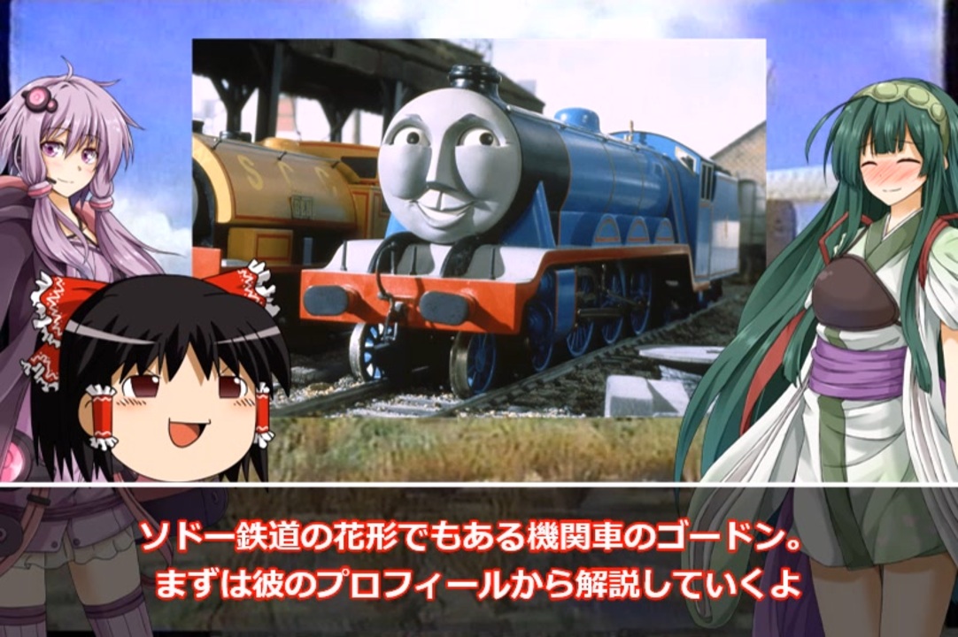 どうもです。あれから何か月も経ちましたが、<br>ようやくゆっくりとゆかりお姉さんが教えるきかんしゃトーマスとなかまたちの新作が出来ました。<br>さて、今回はソドー鉄道の花形機関車とも言えるゴードンの紹介となります。<br>今回も前後編となった上に茶番要素が含まれていますのでそこはご了承願います。<br>(ほんと遅くなってしまってすいません(;´・ω・)><br><br><span style="color: #ff0000;"><strong>ゆっくりさん</strong></span>と<span style="color: #8e7cc3;"><strong>ゆかりさん</strong></span>が<span style="color: #6d9eeb;"><strong>きかんしゃトーマスとその仲間たち</strong></span>について解説する動画となります。<br>また、当動画は原作汽車のえほんとテレビ版1~7期までのキャラクターや設定を取り上げる方針です。<br>8期以降?一切微塵も取り上げませんのであしからず。<br>内容も誤りや省いているところもございます故、そこはご了承願います。<br>動画の感想はメールで送ってください。<br><span style="color: #0000ff;"><strong><u>sodorp@outlook.jp</u></strong></span><br><br><a href="https://www.nicovideo.jp/watch/sm39652832" class="watch">sm39652832</a>←#3(<span style="color: #6aa84f;">ヘンリー</span>編) #4(<span style="color: #1155cc;">ゴードン</span>編後編)→<a href="https://www.nicovideo.jp/watch/sm40887217" class="watch">sm40887217</a><br><br>この動画シリーズを作るきっかけとなった動画<br>DuckHead / WDS様制作<br>ゆっくりとディズニーアニメとシリーズ<br><a href="https://www.nicovideo.jp/mylist/60142128" target="_blank" rel="noopener">mylist/60142128</a><br><br>トーマスの歴史についてはこちら<br>きかんしゃトーマスはこうして生まれた<br><a href="https://www.nicovideo.jp/mylist/65815013" target="_blank" rel="noopener">mylist/65815013</a><br><br>投稿動画一覧<br><a href="https://www.nicovideo.jp/mylist/39678977" target="_blank" rel="noopener">mylist/39678977</a><br><br>今作<br><a href="https://www.nicovideo.jp/mylist/70501770" target="_blank" rel="noopener">mylist/70501770</a><br><br><br>活力の素になるほしいリスト<br><a href="https://x.gd/v2gMF" target="_blank" rel="noopener nofollow">https://x.gd/v2gMF</a>
