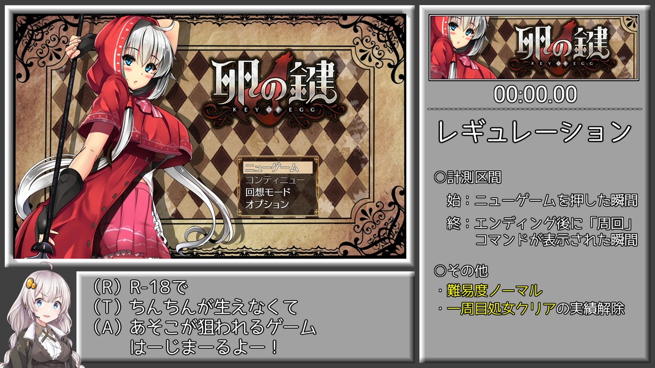 えっちなゲームのRTAです!<br><br>part2 → <a href="https://www.nicovideo.jp/watch/sm41095073" class="watch">sm41095073</a><br><br>計測範囲:ニューゲーム選択~エンディング後に「周回」コマンドが表示された瞬間<br>計測記録:36:19.98<br>クリア後セーブ記録:00:34:07<br><br><span style="color: #ff9900;">R-18に付き閲覧注意!<br>サークル「ハソユア」様よりDLsiteで好評発売中!体験版ダウンロード可能!<br><br>同サークル様の新作「世界の卵 ~夢幻のリーリウム~」が7/9に発売されました!</span><br><br><a href="https://www.nicovideo.jp/mylist/37217032" target="_blank" rel="noopener">mylist/37217032</a>