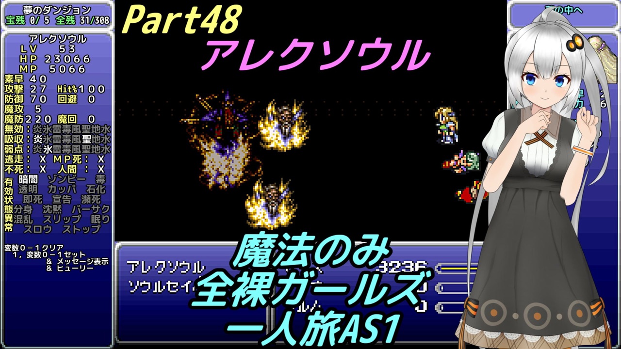 何度もリトライをするとコマンド選択の迷いも無くなってやがて解放されます。<br><br>・次回 … Part49 <a href="https://www.nicovideo.jp/watch/sm40915464" class="watch">sm40915464</a><br>・前回 … Part47 <a href="https://www.nicovideo.jp/watch/sm40746651" class="watch">sm40746651</a><br><br>・Youtube版 … <a href="https://youtu.be/QyhfKJGY64g" target="_blank" rel="noopener nofollow">https://youtu.be/QyhfKJGY64g</a><br>・字幕のみ … <a href="https://youtu.be/-WFOgqaWWQ4" target="_blank" rel="noopener nofollow">https://youtu.be/-WFOgqaWWQ4</a><br><br>【縛り内容】<br>1、魔法のみ<br>2、全裸(魔石はあり)<br>3、ガールズ<br>4、一人旅<br>5、アクティブ バトルスピード1 メッセージスピード1 詳細:<a href="https://www.nicovideo.jp/watch/sm34595412" class="watch">sm34595412</a><br>6、逃げられない!!表示の連射禁止<br>7、ボスの即死は禁止<br>8、宝物は全て集める<br>9、不具合やバグは不可<br>10、可能な限り低レベル<br>11、コマンド短縮やカーソル記憶しない<br>12、セーブ可能な場所でのみアイテム可<br>13、一部ストーリー上の編成でやむを得ない場合は最低限<br /><br>ふよふよしているの<br>絵:横沢さわらさん VOICEVOX:WhiteCUL<br><br>【シリーズ】<br>くうねるきゃんぷ … <a href="https://www.nicovideo.jp/series/516069" target="_blank" rel="noopener">series/516069</a><br>お写んぽ! … <a href="https://www.nicovideo.jp/series/435756" target="_blank" rel="noopener">series/435756</a><br>様子がおかしい! … <a href="https://www.nicovideo.jp/series/418875" target="_blank" rel="noopener">series/418875</a><br>FF7 魔法マテリアのみ初期防具ガールズ一人旅ASM … <a href="https://www.nicovideo.jp/series/438696" target="_blank" rel="noopener">series/438696</a><br>きんかつ!V-STROM1050XT … <a href="https://www.nicovideo.jp/series/144466" target="_blank" rel="noopener">series/144466</a><br>FF6 魔法のみ全裸ガールズ一人旅AS1 … <a href="https://www.nicovideo.jp/series/9438" target="_blank" rel="noopener">series/9438</a><br>おバイク!GLADIUS400 ABS … <a href="https://www.nicovideo.jp/series/68579" target="_blank" rel="noopener">series/68579</a><br>FF5 魔法のみ全裸一人旅AS1 … <a href="https://www.nicovideo.jp/series/9432" target="_blank" rel="noopener">series/9432</a><br>DQ3 呪文のみ全裸一人旅 … <a href="https://www.nicovideo.jp/series/9416" target="_blank" rel="noopener">series/9416</a><br>DQ2 ムーンブルクの王女一人旅 … <a href="https://www.nicovideo.jp/series/9414" target="_blank" rel="noopener">series/9414</a><br>DQ1 全裸 … <a href="https://www.nicovideo.jp/series/9412" target="_blank" rel="noopener">series/9412</a><br>FE 紋章の謎 天馬騎士単騎 第2部 英雄戦争 … <a href="https://www.nicovideo.jp/series/9404" target="_blank" rel="noopener">series/9404</a><br>FE 紋章の謎 天馬騎士単騎 第1部 暗黒戦争 … <a href="https://www.nicovideo.jp/series/9401" target="_blank" rel="noopener">series/9401</a><br>聖剣2 全裸プリム一人旅 武器Lv1など … <a href="https://www.nicovideo.jp/series/9396" target="_blank" rel="noopener">series/9396</a><br>ロマサガ2 魔術士不得意武器のみ … <a href="https://www.nicovideo.jp/series/9388" target="_blank" rel="noopener">series/9388</a><br>ロマサガ1 術法のみ一人旅で各イベント攻略 … <a href="https://www.nicovideo.jp/series/9386" target="_blank" rel="noopener">series/9386</a><br><br>SNSとか色々なリンク … <a href="https://lit.link/Unaa" target="_blank" rel="noopener nofollow">https://lit.link/Unaa</a>
