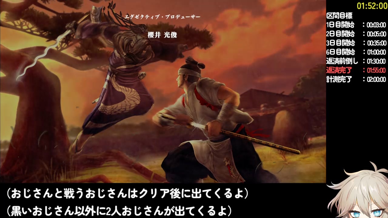 おにぱん!お疲れ様本(公式)発売が決定したので初投稿です。<br><br>前→<a href="https://www.nicovideo.jp/watch/sm40782871" class="watch">sm40782871</a><br>次→⊂おわり⊃<br><br>レギュレーション<br>1.計測開始は「はじめから」を選択時<br>2.計測終了はED後に題名が表示された瞬間<br>3.以下のDLCを使用<br>「風来人セット」<br>「名刀5本セット」<br>4.意図したバグの使用禁止(刀増殖など)<br><br>侍道外伝 KATANAKAMI(Steam版)<br><a href="https://store.steampowered.com/app/1062340/_KATANAKAMI/?l=japanese" target="_blank" rel="noopener nofollow">https://store.steampowered.com/app/1062340/_KATANAKAMI/?l=japanese</a><br>----------------------<br>音声作成、読み上げ:VOICEVOX<br>使用音声:春日部つむぎ、雨晴はう、ずんだもん、九州そら<br>立ち絵:春日部つむぎ立ち絵素材(公式)<br> 雨晴はう公式立ち絵素材<br> ずんだもん公式立ち絵素材<br> 九州そら公式立ち絵素材<br>編集ソフト:AviUtl<br>----------------------