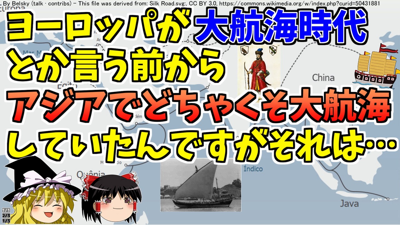 大航海時代…それは人類が狭い世界と飛び出して、初めて海の向こうに進出した時代だった━━<br><br>いや遅い遅い!それ人類じゃなくてヨーロッパ人だけだから!まじウケるんですけど!<br>と、鄭和が申しております。<br><br><br>背景ゲーム画面:Age of Empires Ⅱ<br>Age of Empires Ⅱ © Microsoft Corporation. ゆっくりモンドちゃんねるの一部背景は、Microsoft の「ゲーム コンテンツ利用規約」 に基づき、Age of Empires Ⅱのアセットを使用して作成されたものであり、Microsoft との提携または Microsoft による承認を意味するものではありません。 <br>参照 Xbox ゲームコンテンツ利用規約 <a href="https://www.xbox.com/ja-JP/developers/rules" target="_blank" rel="noopener nofollow">https://www.xbox.com/ja-JP/developers/rules</a><br><br />━━━━━━━━━━━━━━━━━━━━━<br><br>この動画はクリエイティブ・コモンズ継承(CC-BY-SA)ライセンスの素材を使用して制作しています。(<a href="https://creativecommons.org/licenses/by-sa/4.0/)" target="_blank" rel="noopener nofollow">https://creativecommons.org/licenses/by-sa/4.0/)</a><br>規約に基づき、この動画もCC-BY-SA 4.0 のもとで公開します。<br><br>投稿者共通情報☆彡<br><br>BGM, SE:ニコニ・コモンズ様<br><a href="http://commons.nicovideo.jp/" target="_blank" rel="noopener nofollow">http://commons.nicovideo.jp/</a><br>魔王魂様<br><a href="https://maoudamashii.jokersounds.com/" target="_blank" rel="noopener nofollow">https://maoudamashii.jokersounds.com/</a><br>Audiostock様<br><a href="https://audiostock.jp/" target="_blank" rel="noopener nofollow">https://audiostock.jp/</a><br><br>立ち絵 霊夢・魔理沙(黒子式):nicotalk様<br><a href="http://www.nicotalk.com/charasozai.html" target="_blank" rel="noopener nofollow">http://www.nicotalk.com/charasozai.html</a><br><br>立ち絵 パトラ、マリー、アン、メアリ:ライフライフ様<br><a href="https://0801lifelife.tumblr.com/" target="_blank" rel="noopener nofollow">https://0801lifelife.tumblr.com/</a><br><br>使用ツール1:ゆっくりムービーメーカー4<br><a href="https://manjubox.net/ymm4/" target="_blank" rel="noopener nofollow">https://manjubox.net/ymm4/</a><br><br>使用ツール2:AviUtl<br><a href="http://spring-fragrance.mints.ne.jp/aviutl/" target="_blank" rel="noopener nofollow">http://spring-fragrance.mints.ne.jp/aviutl/</a><br><br>各時代の地図 : World History Maps & Timelines <br><a href="http://geacron.com/home-en/" target="_blank" rel="noopener nofollow">http://geacron.com/home-en/</a><br><br>ゆっくりボイスについて:AquesTalkライセンス取得済み<br><br>キャラクターボイス<br>アン・ボニー:羽ノ華(A.I.VOICE)<br>メアリ・リード:琴葉 葵(A.I.VOICE)<br>クレオパトラ:結月ゆかり(VOICEROID2)<br>マリー‐アントワネット:東北きりたん (VOICEROID EX)<br>その他キャラ:青山龍星(A.I.VOICE)、伊織弓鶴(A.I.VOICE2)、栗田まろん(A.I.VOICE)、宮舞モカ(VOICEPEAK)、フリモメン(VOICEPEAK)<br><br><br><br>その他フリー素材ご提供元の皆様に圧倒的感謝<br>
