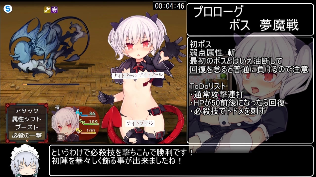 変身ヒロイン凌辱は一般性癖なので初投稿です。<br><br><strong>【サークルくらすけ倉庫】</strong>様制作のR-18RPG<br><strong>【ナイトテール】</strong><span style="font-size: 14px;">トゥルーエンド</span>RTAです。<br><br>計測開始:ニューゲームを選択した瞬間<br>計測終了:選択肢「エンディングへ」を選択した瞬間<br><br>次→<a href="https://www.nicovideo.jp/watch/sm40889718" class="watch">sm40889718</a><br><br>ナイトテールRTAマイリスト→<a href="https://www.nicovideo.jp/mylist/73559923" target="_blank" rel="noopener">mylist/73559923</a><br><br>パート1と単発のマイリスト→<a href="https://www.nicovideo.jp/mylist/70659794" target="_blank" rel="noopener">mylist/70659794</a><br><br><br>twitter:@hihidowser<br><br>スマホやタブレット等から見られない方はこちらの動画を参考にすると<br>見られるようになるはずです→ <a href="https://www.nicovideo.jp/watch/sm38575952" class="watch">sm38575952</a><br><br><strong>[ナイトテール]の購入は下記サイトにて!<br>DLsite(PC)<br><br>FANZA(PC)<br><br>HBOX(スマホ)<br></strong>