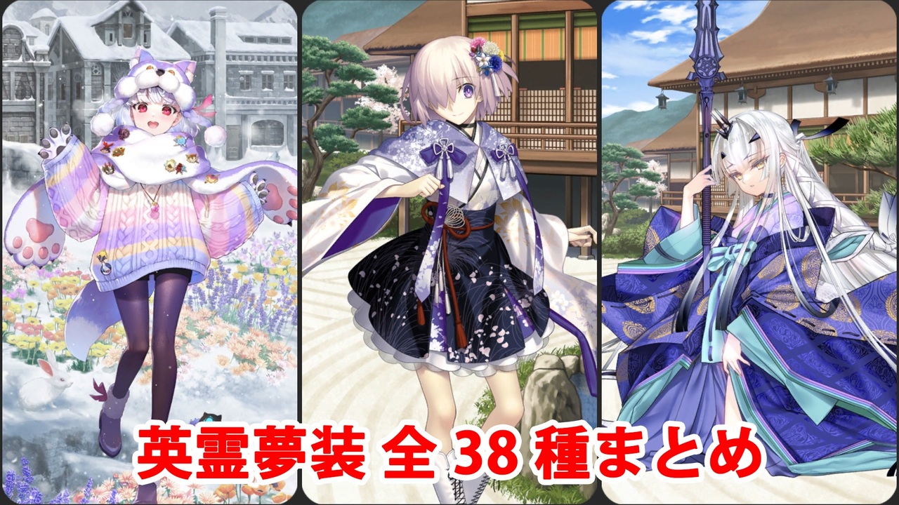 FGO7周年記念礼装 英霊夢装全38種(枠なし・拡大あり)のまとめです。<br><br>【チャプター】<br><a href="#" class="seekTime" data-seekTime="0:00" onclick="seekNicoPlayer('#0:00'); return false;">#0:00</a> 衣装テーマ「ロシア」<br><a href="#" class="seekTime" data-seekTime="1:16" onclick="seekNicoPlayer('#1:16'); return false;">#1:16</a> 衣装テーマ「北欧」<br><a href="#" class="seekTime" data-seekTime="2:33" onclick="seekNicoPlayer('#2:33'); return false;">#2:33</a> 衣装テーマ「中国」<br><a href="#" class="seekTime" data-seekTime="4:02" onclick="seekNicoPlayer('#4:02'); return false;">#4:02</a> 衣装テーマ「インド」<br><a href="#" class="seekTime" data-seekTime="5:31" onclick="seekNicoPlayer('#5:31'); return false;">#5:31</a> 衣装テーマ「ギリシャ」<br><a href="#" class="seekTime" data-seekTime="7:00" onclick="seekNicoPlayer('#7:00'); return false;">#7:00</a> 衣装テーマ「日本」<br><a href="#" class="seekTime" data-seekTime="8:17" onclick="seekNicoPlayer('#8:17'); return false;">#8:17</a> 衣装テーマ「イギリス」<br><br>公式の紹介ムービーはこちらから<br><a href="https://fes.fate-go.jp/gallery/" target="_blank" rel="noopener nofollow">https://fes.fate-go.jp/gallery/</a><br><br>YouTube版はこちら<br><a href="https://www.youtube.com/watch?v=-cdikk4ojQ4" target="_blank" rel="noopener nofollow">https://www.youtube.com/watch?v=-cdikk4ojQ4</a>