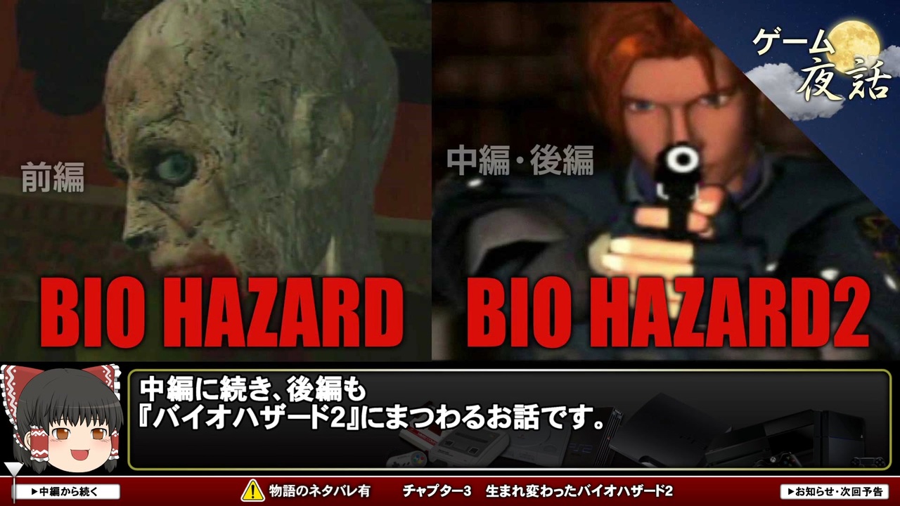 過去動画を宣伝・ギフトして下さった皆さん、ありがとうございましたm(__)m<br>毎回ひとつのゲームを取り上げ、3つのテーマから解説します。<br>【前編】は毎月1日・15日更新、【後編】は制作状況に応じて更新致します。<br><br><strong>原則、「前編」「後編」合わせて毎回約30分を予定しています。</strong><br><br><strong>▼第125回「バイオハザード1・2」</strong><br>前編:<a href="https://www.nicovideo.jp/watch/sm40772302" class="watch">sm40772302</a><br>中編:<a href="https://www.nicovideo.jp/watch/sm40831555" class="watch">sm40831555</a><br><br><strong>▼第7回「バイオハザード4」</strong><br><a href="https://www.nicovideo.jp/watch/sm37684232" class="watch">sm37684232</a><br><br>■youtubeはこちら <a href="https://youtu.be/pG8bi3_v8DY" target="_blank" rel="noopener nofollow">https://youtu.be/pG8bi3_v8DY</a><br>■ゲーム夜話ツイッター <a href="https://twitter.com/gameyawa" target="_blank" rel="noopener nofollow">https://twitter.com/gameyawa</a>