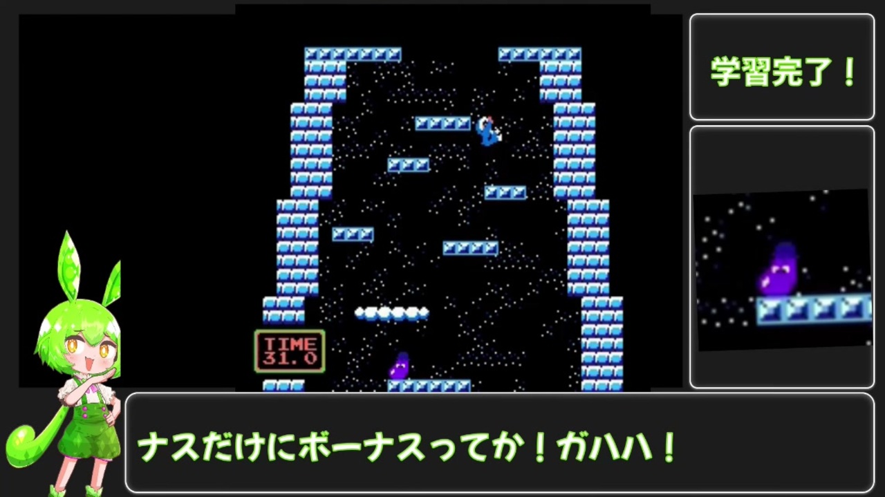 初人工知能です<br>ファミコン版アイスクライマーをAIが攻略する動画<br>VOICEVOX1周年文化祭告知動画 → <a href="https://www.nicovideo.jp/watch/sm40736051" class="watch">sm40736051</a><br>Twitter → <a href="https://twitter.com/AiRashomon" target="_blank" rel="noopener nofollow">https://twitter.com/AiRashomon</a><br><br>実況担当:<br>VOICEVOX ずんだもん(cv伊藤ゆいな)<br><br>OPの読み上げ:<br>VOICEVOX もち子(cv明日葉よもぎ) <br><a href="https://vtubermochio.wixsite.com/mochizora" target="_blank" rel="noopener nofollow">https://vtubermochio.wixsite.com/mochizora</a><br>