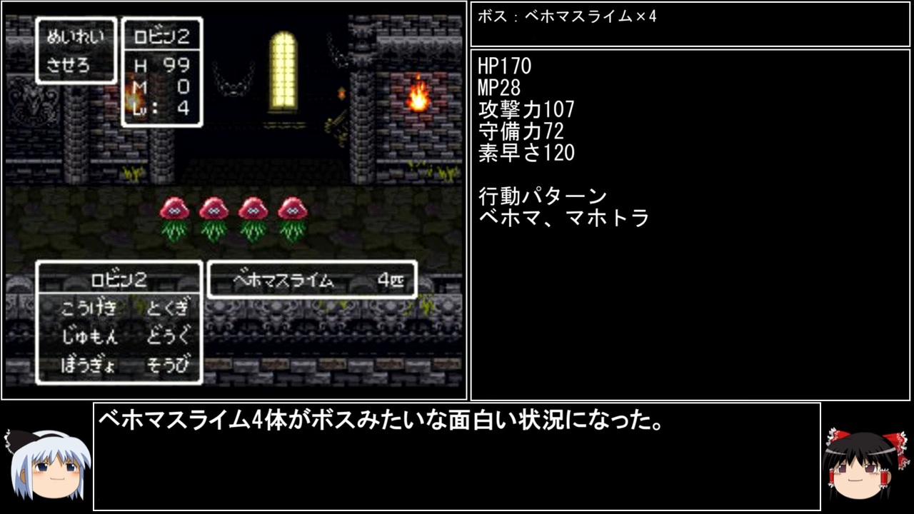前回の動画が自分の100本目の投稿だったことに後で気付きました。<br>part100は間違いなく超える勢い。投稿上限が無制限になって本当に良かったです。<br><br>前→<a href="https://www.nicovideo.jp/watch/sm40840380" class="watch">sm40840380</a> 次→<a href="https://www.nicovideo.jp/watch/sm40873581" class="watch">sm40873581</a><br><br>YouTube版→<a href="https://youtu.be/qOQgncLSulI" target="_blank" rel="noopener nofollow">https://youtu.be/qOQgncLSulI</a><br><br><br>※動画の大きさが変わる方は、お手数ですが設定→画質を自動から〇pに変えると解決します。<br>※一部機種は互換機を使用してのプレイとなります。<br><br>縛りルール(不明点はシリーズのQ&Aを参照)<br>①使った武器・防具・装飾品・道具・呪文・特技・一部特殊施設(メダル王・カジノ・移民の町)・職業(3,6,7)・仲間モンスター(4,5,6,8+7の職業)は次以降のシリーズで使用禁止。<br>(NPCキャラが使用した装備や呪文を含む。売却及び錬金素材としても使用扱い)<br><br>②裏技・バグ技の禁止。<br><br>③逃走禁止&戦闘終了時は全員生存。<br><br>④レベルを上げ過ぎない。<br>ダンジョンやボスは公式ガイドブックに記載されたレベル+3まで。<br>ラスボスは全ての呪文を習得するレベル+3程度までに収める。<br><br>⑤裏ボスも規定回数、規定ターン以内に倒す。<br>(6の裏ダンジョン突入時のみ、条件を満たすため①の職業を解禁)<br><br>(おまけ)<br>宝は可能なものに限り全回収。<br>5と6は同一モンスターの仲間不可。<br>回避可能なボスも全て倒す。<br><br><br>この動画で利用している株式会社スクウェア・エニックスを代表とする共同著作者が権利を所有する著作物及びスギヤマ工房有限会社が権利を所有する楽曲の転載・配布は禁止いたします。<br>(C) ARMOR PROJECT/BIRD STUDIO/SQUARE ENIX All Rights Reserved.<br>(C) SUGIYAMA KOBO (P) SUGIYAMA KOBO<br><br>AquesTalk2ライセンスID:AQTK2WINUSR23122185<br /><br><br>❤いいねを押していただけるとモチベーションと投稿速度が上がるので宜しくお願い致します!<br><br>作者ツイッター→ <a href="https://twitter.com/nig0117" target="_blank" rel="noopener nofollow">https://twitter.com/nig0117</a><br>PIXIV FANBOX→ <a href="https://sutanokeiji.fanbox.cc/" target="_blank" rel="noopener nofollow">https://sutanokeiji.fanbox.cc/</a><br><br>( 以前はWEB小説書いてました→ <a href="https://kakuyomu.jp/works/1177354054884910267" target="_blank" rel="noopener nofollow">https://kakuyomu.jp/works/1177354054884910267</a> )