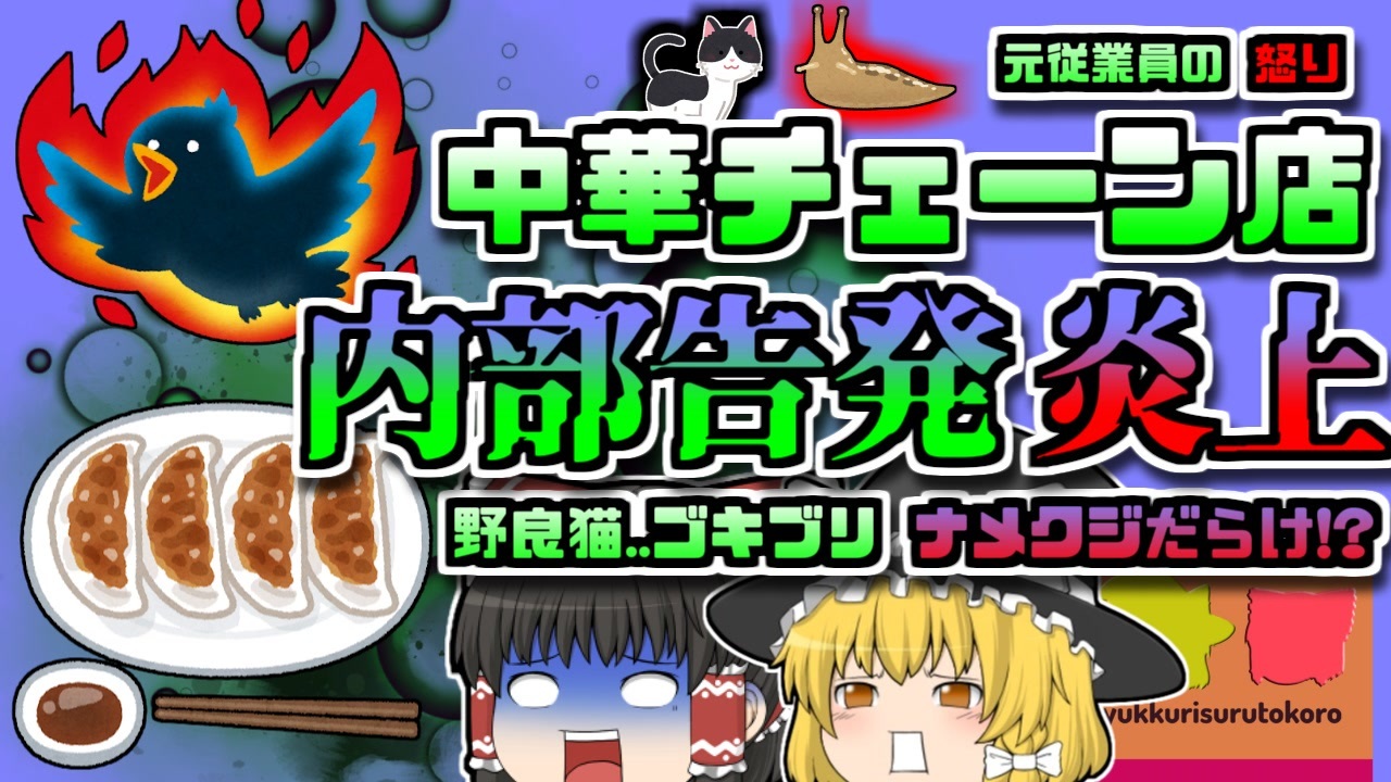 今回紹介するのは、多くのリクエストがありました、<br>「仙台中華チェーン店炎上事件」です。<br>2022年7月。仙台市内にある中華チェーン店が、<br>ネット上で大炎上し、営業休止となっていました。<br>ことの発端は、数日前にTwitterに投稿された、元店員男性「Aさん」の暴露投稿でした。<br>彼はかつて、この店舗で正社員として働いていましたが、そのあまりに不衛生な労働環境、ひどい待遇に嫌気がさし、退職したばかりで、内部事情を暴露するため、過去にナメクジだらけになっていた厨房の写真や、店舗内で飼育していた野良猫の写真などを投稿し、それが一気に拡散され、店は大炎上。<br>すぐに保健所にも多数の調査依頼が届き、店には保健所の検査が入りました。<br><br><a href="#" class="seekTime" data-seekTime="00:00" onclick="seekNicoPlayer('#00:00'); return false;">#00:00</a> 冒頭挨拶<br><a href="#" class="seekTime" data-seekTime="00:36" onclick="seekNicoPlayer('#00:36'); return false;">#00:36</a> 視聴上の注意<br><a href="#" class="seekTime" data-seekTime="1:25" onclick="seekNicoPlayer('#1:25'); return false;">#1:25</a> 現地の説明<br><a href="#" class="seekTime" data-seekTime="2:39" onclick="seekNicoPlayer('#2:39'); return false;">#2:39</a> 元従業員「Aさん」の告発<br><a href="#" class="seekTime" data-seekTime="3:49" onclick="seekNicoPlayer('#3:49'); return false;">#3:49</a> 店舗の衛生環境<br><a href="#" class="seekTime" data-seekTime="5:32" onclick="seekNicoPlayer('#5:32'); return false;">#5:32</a> 保健所・市議も動き出す<br><a href="#" class="seekTime" data-seekTime="6:01" onclick="seekNicoPlayer('#6:01'); return false;">#6:01</a> 検査結果<br><a href="#" class="seekTime" data-seekTime="6:54" onclick="seekNicoPlayer('#6:54'); return false;">#6:54</a> 管理者不在・不衛生な環境<br><a href="#" class="seekTime" data-seekTime="7:38" onclick="seekNicoPlayer('#7:38'); return false;">#7:38</a> 洗濯機・野良猫<br><a href="#" class="seekTime" data-seekTime="9:27" onclick="seekNicoPlayer('#9:27'); return false;">#9:27</a> 市の対応 処分<br><a href="#" class="seekTime" data-seekTime="10:00" onclick="seekNicoPlayer('#10:00'); return false;">#10:00</a> 検査への指摘<br><a href="#" class="seekTime" data-seekTime="10:52" onclick="seekNicoPlayer('#10:52'); return false;">#10:52</a> 過去の検査にも疑問<br><a href="#" class="seekTime" data-seekTime="11:48" onclick="seekNicoPlayer('#11:48'); return false;">#11:48</a> 何故抜き打ちではないのか?<br><a href="#" class="seekTime" data-seekTime="13:19" onclick="seekNicoPlayer('#13:19'); return false;">#13:19</a> 保健所から12の指摘項目<br><a href="#" class="seekTime" data-seekTime="14:56" onclick="seekNicoPlayer('#14:56'); return false;">#14:56</a> 消費者からはわからない部分<br><a href="#" class="seekTime" data-seekTime="16:05" onclick="seekNicoPlayer('#16:05'); return false;">#16:05</a> 安い商品・サービスの裏側<br><a href="#" class="seekTime" data-seekTime="16:39" onclick="seekNicoPlayer('#16:39'); return false;">#16:39</a> Aさんの思い<br><a href="#" class="seekTime" data-seekTime="18:35" onclick="seekNicoPlayer('#18:35'); return false;">#18:35</a> 消費者も考えるべきことはある<br> <br>引用・出展・参考文献<br>厚生労働省<br>HACCP<br><a href="https://ishort.ink/QH3w" target="_blank" rel="noopener nofollow">https://ishort.ink/QH3w</a><br><a href="https://ishort.ink/B8RV" target="_blank" rel="noopener nofollow">https://ishort.ink/B8RV</a><br>令和3年度 食品衛生法改正事項実態把握等事業 概要<br><a href="https://ishort.ink/VBS4" target="_blank" rel="noopener nofollow">https://ishort.ink/VBS4</a><br>食品安全委員会<br><a href="https://ishort.ink/TwvR" target="_blank" rel="noopener nofollow">https://ishort.ink/TwvR</a><br>仙台市<br><a href="https://ishort.ink/MVLx" target="_blank" rel="noopener nofollow">https://ishort.ink/MVLx</a><br>仙台市保健所<br><a href="https://ishort.ink/B8RV" target="_blank" rel="noopener nofollow">https://ishort.ink/B8RV</a><br>産経新聞<br><a href="https://ishort.ink/qf44" target="_blank" rel="noopener nofollow">https://ishort.ink/qf44</a><br>その他視聴者提供資料など<br><br />※この動画は過去の事件を知り、現在でも同じことが発生する危険性を再認識、関与しないように促すための動画であり、視聴者を扇動、動揺を誘うためのコンテンツではありません。<br><br>ご要望にお応えして、メンバーシップの開設を行いました。<br>下記URLからも登録可能ですので、ご興味がある方は是非ご参加ください。<br><a href="https://www.youtube.com/channel/UCcT5a1J7XJW7CLYI2RKl4pw/join" target="_blank" rel="noopener nofollow">https://www.youtube.com/channel/UCcT5a1J7XJW7CLYI2RKl4pw/join</a><br><br><br>Twitter<br>→<a href="https://twitter.com/yukkurisurutoko" target="_blank" rel="noopener nofollow">https://twitter.com/yukkurisurutoko</a><br><br>取り急ぎ、簡易的にですがマイリストを作りました。<br>【ゆっくり解説】事故・事件関係紹介リスト <br><a href="https://www.nicovideo.jp/mylist/71034319" target="_blank" rel="noopener nofollow">https://www.nicovideo.jp/mylist/71034319</a><br>【ゆっくり解説】放射線系事故<br><a href="https://www.nicovideo.jp/mylist/71034368" target="_blank" rel="noopener nofollow">https://www.nicovideo.jp/mylist/71034368</a><br>【ゆっくり解説】鉄道系事故・事件関連<br><a href="https://www.nicovideo.jp/mylist/71034379" target="_blank" rel="noopener nofollow">https://www.nicovideo.jp/mylist/71034379</a>