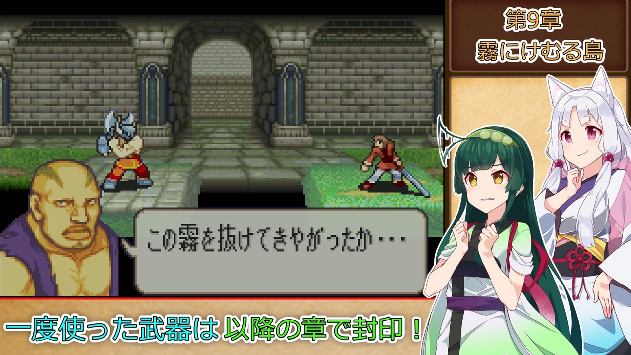 <span style="color: #85200c; font-size: 18px;"><strong><i>遂に新たな舞台へ…!</i></strong></span><br><br><strong>ルール1:一度使用した武器は、以降の章で使用する事を禁止する。<br>ルール2:武器の使用の定義は『その武器を装備した状態で敵との戦闘が発生したタイミング』『その武器を売却して換金した場合』杖の場合は『対象に対して使用した時点(命中の可否は問わない)』とする。<br>ルール3:難易度はハードとする。<br>ルール4:1章から終章まで全ての章を攻略し、仲間に出来るユニットは全員加入させ、生存させる。</strong><br><span style="color: #ff0000;"><strong>※ただしルート分岐次第で行けない章、加入出来ない仲間は除外。</strong></span><br><br>本動画のシリーズリスト【<a href="https://www.nicovideo.jp/series/316824" target="_blank" rel="noopener">series/316824</a>】<br>part1【<a href="https://www.nicovideo.jp/watch/sm40376370" class="watch">sm40376370</a>】<br>前:【<a href="https://www.nicovideo.jp/watch/sm40813017" class="watch">sm40813017</a>】次:【<a href="https://www.nicovideo.jp/watch/sm40922630" class="watch">sm40922630</a>】<br><br><strong>使用したソフト</strong><br>VOICEROID+東北きりたんEX<br>VOICEROID+東北ずん子EX<br>VOICEROID2 東北イタコ<br>VOICEVOX:ずんだもん<br><strong>お借りした立ち絵</strong><br>【<a href="https://seiga.nicovideo.jp/seiga/im10626877" target="_blank" rel="noopener">im10626877</a>】【<a href="https://seiga.nicovideo.jp/seiga/im10910197" target="_blank" rel="noopener">im10910197</a>】【<a href="https://seiga.nicovideo.jp/seiga/im10886085" target="_blank" rel="noopener">im10886085</a>】【<a href="https://seiga.nicovideo.jp/seiga/im10572401" target="_blank" rel="noopener">im10572401</a>】<br><strong>お借りした素材</strong><br>ニコニコモンズの皆様(コンテンツツリー参照)<br />VOICEVOXホームページ:<a href="https://voicevox.hiroshiba.jp/" target="_blank" rel="noopener nofollow">https://voicevox.hiroshiba.jp/</a><br>編集ソフト :YMM4<br>投稿動画part1まとめマイリスト:<a href="https://www.nicovideo.jp/mylist/72070653" target="_blank" rel="noopener">mylist/72070653</a><br>あまり喋らないツイッター:<a href="https://twitter.com/titeinotami" target="_blank" rel="noopener nofollow">https://twitter.com/titeinotami</a>