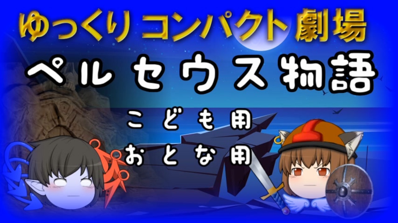 「ゆっくり文庫リスペクト」第十二弾。<br><br>今回はギリシャ神話の英雄「ペルセウス」が題材です。<br>ほぼ1年ぶりの「こども用」と「おとな用」。<br>ギリシャ神話の英雄って結構悲劇な事が多いですが、彼は比較的マシ。<br><br>こども用はとてもマイルドな翻案をしています。<br>お父さんお母さんも、安心してお子様に見せてあげてください。<br><br>おとな用は、本家物語を懐かしい雰囲気で作りあげております。<br>ノスタルジックな雰囲気のもとギリシャの英雄譚をお楽しみください。<br><br>・こども用 <a href="#" class="seekTime" data-seekTime="0:20" onclick="seekNicoPlayer('#0:20'); return false;">#0:20</a><br>・おとな用 <a href="#" class="seekTime" data-seekTime="5:15" onclick="seekNicoPlayer('#5:15'); return false;">#5:15</a><br><br>前⇒<a href="https://www.nicovideo.jp/watch/sm40417169" class="watch">sm40417169</a><br><br>次⇒<a href="https://www.nicovideo.jp/watch/sm41239888" class="watch">sm41239888</a><br><br><br />うp主のクリ奨扱いの番組(ギフト)<br>●動画投稿講座(海兵隊式)<br><a href="https://www.nicovideo.jp/watch/sm41183459" class="watch">sm41183459</a><br><br>●ほしいものリスト(同じものでも全然嬉しい)<br><a href="https://www.amazon.co.jp/hz/wishlist/ls/20X2QKDPSW451?ref_=wl_share" target="_blank" rel="noopener nofollow">https://www.amazon.co.jp/hz/wishlist/ls/20X2QKDPSW451?ref_=wl_share</a><br>●匿名で送る方法<br><a href="https://appllio.com/amazon-wish-list" target="_blank" rel="noopener nofollow">https://appllio.com/amazon-wish-list</a><br><br>うp主の動画<br>ゆっくりのワイドショー⇒<a href="https://www.nicovideo.jp/mylist/45200880" target="_blank" rel="noopener">mylist/45200880</a><br>ゆっくりコンパクト劇場⇒<a href="https://www.nicovideo.jp/mylist/67330756" target="_blank" rel="noopener">mylist/67330756</a><br>ゆっくりロードショー⇒<a href="https://www.nicovideo.jp/mylist/51596849" target="_blank" rel="noopener">mylist/51596849</a><br>おもちゃ箱⇒<a href="https://www.nicovideo.jp/series/265908" target="_blank" rel="noopener">series/265908</a><br>ようつべセブンのチャンネル<br><a href="http://www.youtube.com/c/sevenyoutube" target="_blank" rel="noopener nofollow">http://www.youtube.com/c/sevenyoutube</a><br><br>ニコニコ大百科 ゆっくりのワイドショー<br><a href="https://dic.nicovideo.jp/id/5337230" target="_blank" rel="noopener nofollow">https://dic.nicovideo.jp/id/5337230</a><br><br>ニコニコ大百科 ゆっくり文庫リスペクト<br><a href="https://dic.nicovideo.jp/id/5701480" target="_blank" rel="noopener nofollow">https://dic.nicovideo.jp/id/5701480</a>