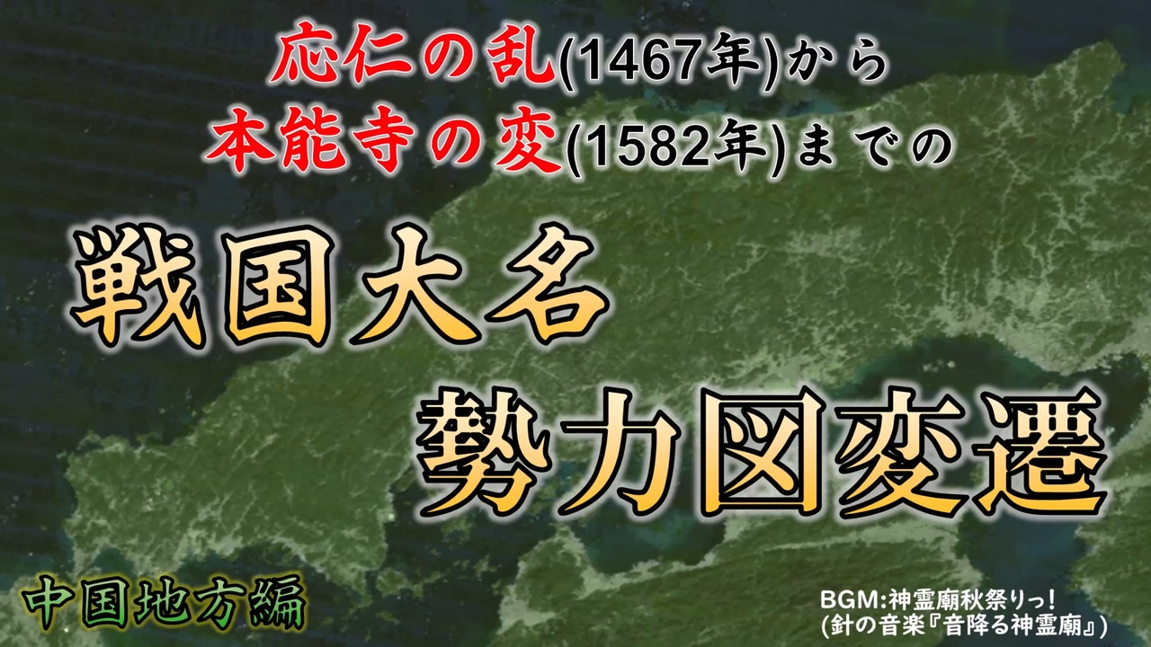応仁の乱(1467年)から本能寺の変(1582年)までの中国地方の勢力図変遷と主要合戦についてリアルタイムでまとめてみました。<br><br>毛利元就解説(進行中):<a href="https://www.nicovideo.jp/watch/sm40641823" class="watch">sm40641823</a><br>大内義興解説:<a href="https://www.nicovideo.jp/watch/sm37319746" class="watch">sm37319746</a><br>尼子経久解説:<a href="https://www.nicovideo.jp/watch/sm38497945" class="watch">sm38497945</a><br>宇喜多直家解説:<a href="https://www.nicovideo.jp/watch/sm39256726" class="watch">sm39256726</a><br><br>・使用楽曲:針の音楽<br><a href="https://www.nicovideo.jp/user/8184234" target="_blank" rel="noopener nofollow">https://www.nicovideo.jp/user/8184234</a><br><br>『音降る神霊廟』より<br>「神霊廟秋祭りっ!」<br>(アレンジ:白鷺ゆっきー 様)<br><a href="https://www.nicovideo.jp/watch/sm37399085" class="watch">sm37399085</a><br><br>・地図:国土地理院<br><br>・参考文献<br>「岡山県中世城館跡総合調査報告書」<br>「播磨国宍粟郡広瀬宇野氏の史料と研究」<br>「久世町史 資料編」<br>鳥取県編 『尼子氏の戦国時代と鳥取』<br>鳥取県編 『織田vs毛利ー鳥取城をめぐる攻防ー』<br>渡邊大門 『宇喜多直家・秀家―西国進発の魁とならんー』<br>岸田裕之 『毛利元就ー武威天下無双、下民憐愍の文徳は未だー』<br>光成準治 『毛利輝元ー西国の儀任せ置かるの由候ー』<br>光成準治 『小早川隆景・秀秋ー消え候わんとて、光増すと申すー』<br>藤井崇 『大内義隆ー類葉武徳の家を称し、大名の器に載るー』<br>藤井崇 『大内義興 西国の「覇者」の誕生』<br>河村昭一 『安芸武田氏』<br>渡邊大門 『備前浦上氏』<br>小和田哲男『黒田如水ー臣下百姓の罰恐るべしー』<br>大西泰正編『備前宇喜多氏』<br>市川裕士編『山陰山名氏』<br>大薮海 『応仁・文明の乱と明応の政変』<br>長谷川博史『大内氏の興亡と西日本社会』<br>池淳 『毛利領国の拡大と尼子・大友氏』<br>山本浩樹 『西国の戦国合戦』<br>岸田裕之 『講演録で読む 中国地域の戦国時代史』<br>小川雄 『水軍と海賊の戦国史』<br>佐伯徳哉 『出雲の中世 地域と国家のはざま』<br>大西泰正 『宇喜多秀家 秀吉が認めた可能性』<br><br>Youtube; <a href="https://www.youtube.com/channel/UCRyZjTeQgxd8iXcL2P8vwNA" target="_blank" rel="noopener nofollow">https://www.youtube.com/channel/UCRyZjTeQgxd8iXcL2P8vwNA</a><br>Twitter; <a href="https://twitter.com/SquareDeerHorn" target="_blank" rel="noopener nofollow">https://twitter.com/SquareDeerHorn</a>