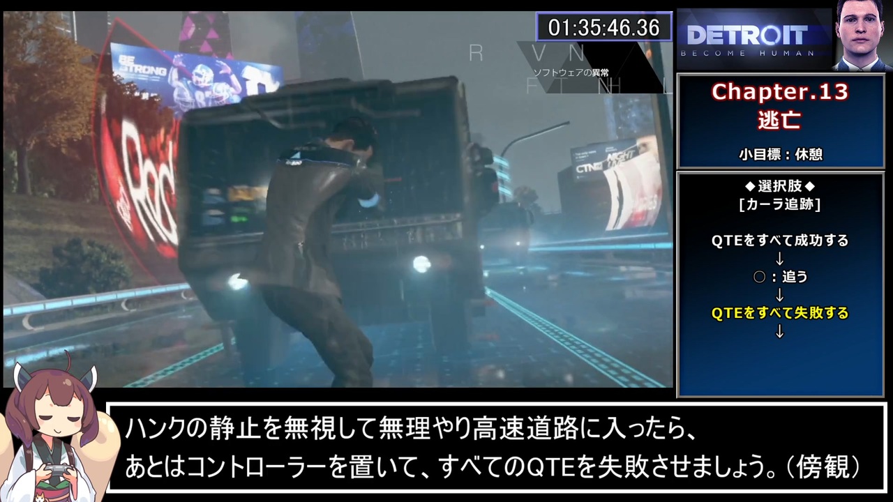 PCを新調してエンコード速度が8.10893倍に向上しましたが、<br>投稿者の編集能力がボトルネックとなり、<br>編集速度は1.14514倍の向上にとどまったため、投稿頻度は変わりません(屑)<br><br>※ショートムービー『KARA』<br><a href="https://www.youtube.com/watch?v=8wWHxIfwS1k" target="_blank" rel="noopener nofollow">https://www.youtube.com/watch?v=8wWHxIfwS1k</a><br><br>※P.S.<br>ボイロの辞書データの移行を忘れていたので、全部吹っ飛びました。<br>その関係で、『おk↑』の発音が変わっています(諦め)<br><br>Chapter.13開始~Chapter.14終了まで<br><br><a href="https://www.nicovideo.jp/watch/sm40845998" class="watch">sm40845998</a>←前|<a href="https://www.nicovideo.jp/mylist/73392456" target="_blank" rel="noopener">mylist/73392456</a>|次→<a href="https://www.nicovideo.jp/watch/sm40898493" class="watch">sm40898493</a><br><br>RTA part1集 <a href="https://www.nicovideo.jp/mylist/71936684" target="_blank" rel="noopener">mylist/71936684</a><br>進捗報告とか <a href="https://twitter.com/KemotooooN_RTA" target="_blank" rel="noopener nofollow">https://twitter.com/KemotooooN_RTA</a><br><br>※本動画シリーズでは、東北ずん子公式様が配布しているイラストを使用しております。<br> 東北ずん子のイラスト/3Dデータ - <a href="https://zunko.jp/con_illust.html" target="_blank" rel="noopener nofollow">https://zunko.jp/con_illust.html</a><br><br><strong><u>▼プレイ環境</u></strong><br>・本体(実機):PS4(Not Pro/SSD換装なし)<br>・コントローラ:付属のやつ<br>・ゲーム:ダウンロード版<br><br><strong><u>▼レギュレーション/縛り等</u></strong><br>・計測開始:CHAPTERから『人質』を選択し、ロードが完了した瞬間<br>・計測終了:30話の選択肢『走る』を選択したのち、メインメニューに戻り表示された瞬間<br><br><a target="_blank" href="https://qa.nicovideo.jp/faq/show/19424?site_domain=default" style="font-size: 13px;color: #657586; text-decoration: underline; line-height: 1.4">この動画は投稿者によって修正されました</a>