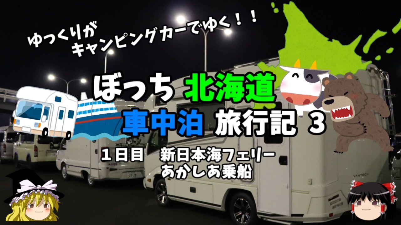 <span style="color: #ff0000; font-size: medium;"><u>※Youtubeで1話分、先行配信中 </u></span><br><span style="color: #0000ff; font-size: medium;"> <a href="http://www.youtube.com/c/なめこのぼっち旅" target="_blank" rel="noopener nofollow">http://www.youtube.com/c/なめこのぼっち旅</a></span><br><br><br>2022年GWに北海道にキャンピングカーで行ってきました!<br>その模様をお伝えします!<br><br>フェリーに乗り込みますよ!<br><br><span style="color: #ff0000;">コミュニティー→co2910020</span><br><br>twitter→<a href="https://twitter.com/ryontan" target="_blank" rel="noopener nofollow">https://twitter.com/ryontan</a><br><br><a href="https://www.nicovideo.jp/watch/sm40849963" class="watch">sm40849963</a>← 前回 <span style="color: #ff0000;">次回 →</span><a href="https://www.nicovideo.jp/watch/sm40913067" class="watch">sm40913067</a><br><br>今作 北海道車中泊旅行記→<a href="https://www.nicovideo.jp/mylist/73483035" target="_blank" rel="noopener">mylist/73483035</a><br>前作 モルディブ旅行記→<a href="https://www.nicovideo.jp/mylist/72339602" target="_blank" rel="noopener">mylist/72339602</a><br>東欧旅行記→<a href="https://www.nicovideo.jp/mylist/70339665" target="_blank" rel="noopener">mylist/70339665</a><br>解説・雑談系→<a href="https://www.nicovideo.jp/mylist/63171869" target="_blank" rel="noopener">mylist/63171869</a><br>スイス旅行記<span style="color: #000000; font-size: 14px;">→</span><a href="https://www.nicovideo.jp/mylist/68347869" target="_blank" rel="noopener">mylist/68347869</a><br>スペイン周遊記→<a href="https://www.nicovideo.jp/mylist/64537827" target="_blank" rel="noopener">mylist/64537827</a><br>韓国トルコ旅行記→<a href="https://www.nicovideo.jp/mylist/63654428" target="_blank" rel="noopener">mylist/63654428</a><br>車中泊旅行記→<a href="https://www.nicovideo.jp/mylist/54706524" target="_blank" rel="noopener">mylist/54706524</a><br>久米島(沖縄)旅行記→<a href="https://www.nicovideo.jp/mylist/63059251" target="_blank" rel="noopener">mylist/63059251</a><br>イギリスタイ旅行記→<a href="https://www.nicovideo.jp/mylist/60044833" target="_blank" rel="noopener">mylist/60044833</a><br>クルーズ旅行記→<a href="https://www.nicovideo.jp/mylist/57397685" target="_blank" rel="noopener">mylist/57397685</a><br>ドイツ周遊記→<a href="https://www.nicovideo.jp/mylist/54938346" target="_blank" rel="noopener">mylist/54938346</a><br>北海道旅行記→<a href="https://www.nicovideo.jp/mylist/52618057" target="_blank" rel="noopener">mylist/52618057</a><br>アメリカ横断記→<a href="https://www.nicovideo.jp/mylist/48621785" target="_blank" rel="noopener">mylist/48621785</a><br>イタリア周遊記→<a href="https://www.nicovideo.jp/mylist/45763559" target="_blank" rel="noopener">mylist/45763559</a><br>NY旅行記→<a href="https://www.nicovideo.jp/mylist/44343854" target="_blank" rel="noopener">mylist/44343854</a>