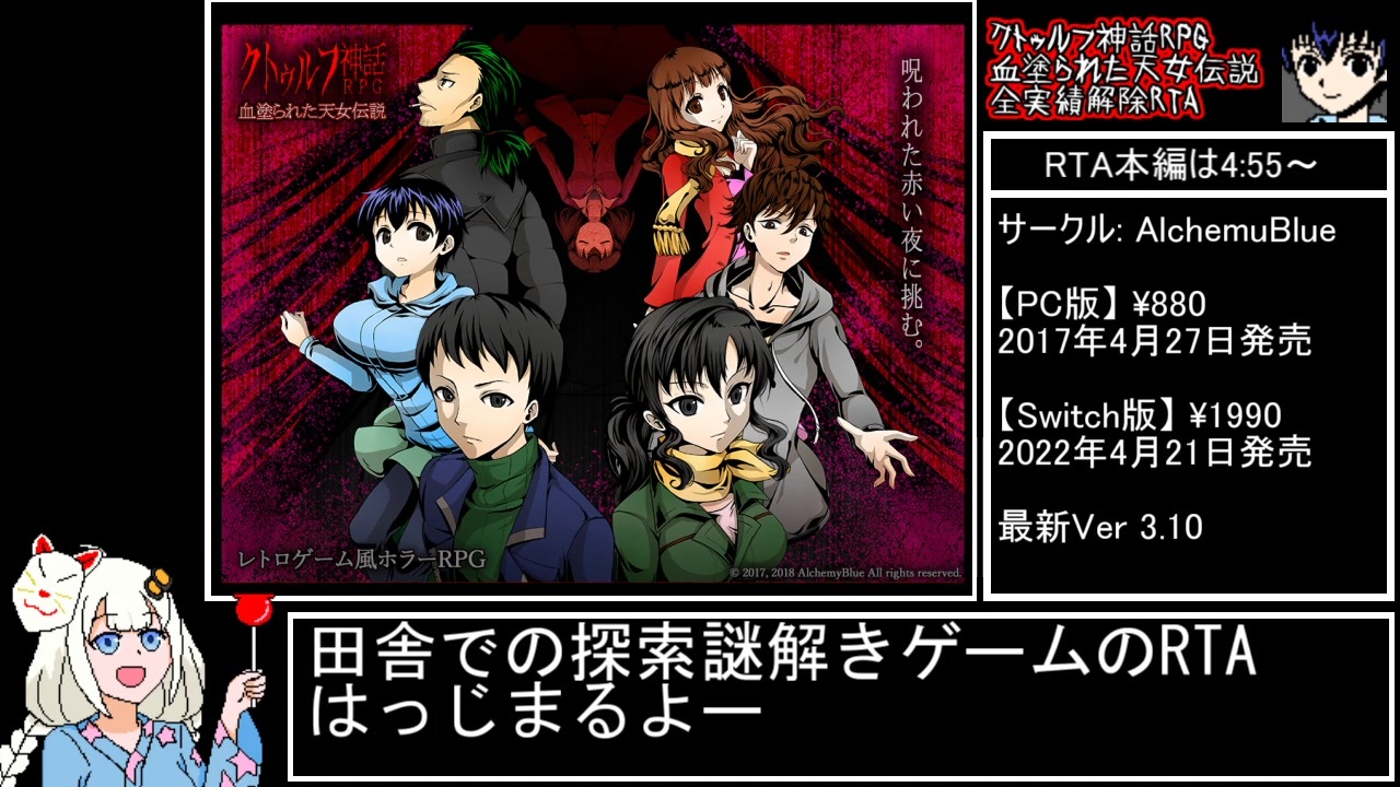 このゲーム面白いから<br>未プレイ兄貴たちにはぜひ遊んでほしいです<br><br>【原作PC版】<br><a href="https://www.dlsite.com/home/work/=/product_id/RJ180292.html" target="_blank" rel="noopener nofollow">https://www.dlsite.com/home/work/=/product_id/RJ180292.html</a><br>【Nintendo Switch版】<br><a href="https://store-jp.nintendo.com/list/software/70010000050037.html" target="_blank" rel="noopener nofollow">https://store-jp.nintendo.com/list/software/70010000050037.html</a><br><br>一日目昼 自由行動開始まで<br><br>RTA Part1リンク : <a href="https://www.nicovideo.jp/mylist/71640429" target="_blank" rel="noopener">mylist/71640429</a><br><br>クトゥルフ神話RPG「血塗られた天女伝説」<br>制作サークル「AlchemyBlue」<a href="https://www.alchemyblue.net/" target="_blank" rel="noopener nofollow">https://www.alchemyblue.net/</a>
