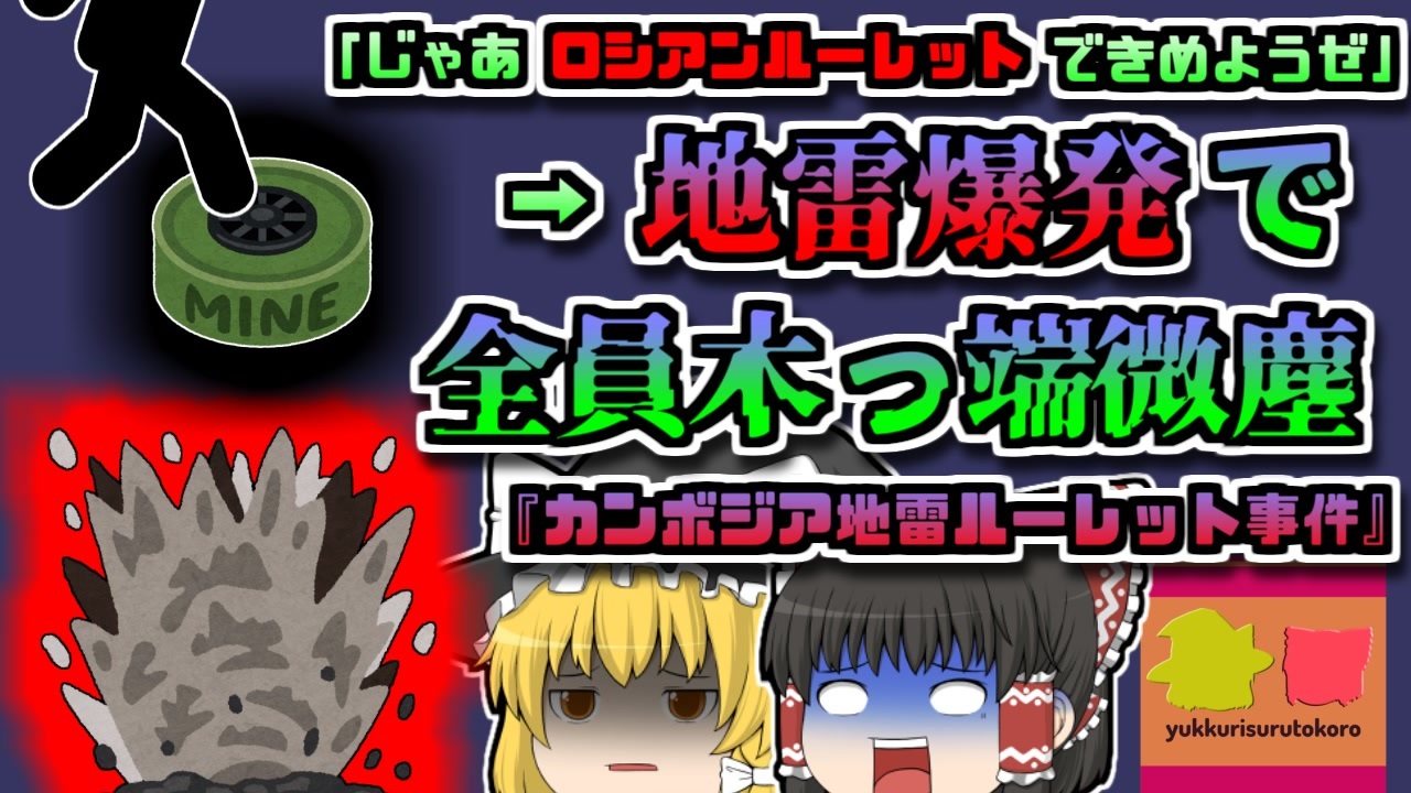 今回紹介するのは、以前から多くのリクエストがありました「カンボジア地雷ロシアンルーレット」の事例です。<br>カンボジアの首都、プノンペンにある飲食店のテラス席では、三人の若者がお酒を飲み、会話を楽しんでいました。<br>しかし、次第にそれは口論となり、ヒートアップしてあわや喧嘩に発展しそうな事態に。<br>するとその中の一人の男性客「Aさん」は、テラス席から店の裏庭に消え、大きな金属製の丸い物体をもって戻ってきました。<br>彼はそれを自分たちのテーブルの下に放り投げると<br>「だったら誰が一番正しいか、勇気があるか決めよう」と言い出しました。<br>彼が持ってきたのは、25年以上前にこの地で発見された「対戦車地雷」。<br>なんと、Aさんはこの地雷を順番に踏む、ロシアンルーレットをしようと、仲間二人に持ち掛けていたのです。<br><br><a href="#" class="seekTime" data-seekTime="00:00" onclick="seekNicoPlayer('#00:00'); return false;">#00:00</a> 冒頭挨拶<br><a href="#" class="seekTime" data-seekTime="00:34" onclick="seekNicoPlayer('#00:34'); return false;">#00:34</a> 視聴上の注意<br><a href="#" class="seekTime" data-seekTime="1:15" onclick="seekNicoPlayer('#1:15'); return false;">#1:15</a> 現地の説明<br><a href="#" class="seekTime" data-seekTime="2:41" onclick="seekNicoPlayer('#2:41'); return false;">#2:41</a> テラスで飲んでいた若者たち<br><a href="#" class="seekTime" data-seekTime="3:24" onclick="seekNicoPlayer('#3:24'); return false;">#3:24</a> ヒートアップする彼ら<br><a href="#" class="seekTime" data-seekTime="3:57" onclick="seekNicoPlayer('#3:57'); return false;">#3:57</a> 恐ろしいルーレット<br><a href="#" class="seekTime" data-seekTime="5:07" onclick="seekNicoPlayer('#5:07'); return false;">#5:07</a> 「ロシアンルーレット」<br><a href="#" class="seekTime" data-seekTime="6:53" onclick="seekNicoPlayer('#6:53'); return false;">#6:53</a> 突然大爆発<br><a href="#" class="seekTime" data-seekTime="7:47" onclick="seekNicoPlayer('#7:47'); return false;">#7:47</a> 三人は木っ端みじんに・・・<br><a href="#" class="seekTime" data-seekTime="8:26" onclick="seekNicoPlayer('#8:26'); return false;">#8:26</a> 事件の背景<br><a href="#" class="seekTime" data-seekTime="10:27" onclick="seekNicoPlayer('#10:27'); return false;">#10:27</a> 不発弾はわが国にも<br><a href="#" class="seekTime" data-seekTime="12:08" onclick="seekNicoPlayer('#12:08'); return false;">#12:08</a> 怪しい物体を見つけたら<br><br><br><br>引用・出展・参考文献<br>沖縄県 不発弾を見つけたら<br><a href="https://ishort.ink/yh9P" target="_blank" rel="noopener nofollow">https://ishort.ink/yh9P</a><br>讀賣新聞オンライン<br><a href="https://ishort.ink/WU1z" target="_blank" rel="noopener nofollow">https://ishort.ink/WU1z</a><br>READYFOR<br><a href="https://ishort.ink/zWaH" target="_blank" rel="noopener nofollow">https://ishort.ink/zWaH</a><br>認定NPO法人テラ・ルネッサンス<br><a href="https://ishort.ink/JDs7" target="_blank" rel="noopener nofollow">https://ishort.ink/JDs7</a><br>Ganas 途上国を知る。世界が広がる。<br><a href="https://ishort.ink/H1do" target="_blank" rel="noopener nofollow">https://ishort.ink/H1do</a><br>REENSUN JAPAN<br><a href="https://ishort.ink/CGDX" target="_blank" rel="noopener nofollow">https://ishort.ink/CGDX</a><br>産経ニュース<br><a href="https://ishort.ink/XTE4" target="_blank" rel="noopener nofollow">https://ishort.ink/XTE4</a><br>1999 Darwin Awards <br><a href="https://ishort.ink/4mkQ" target="_blank" rel="noopener nofollow">https://ishort.ink/4mkQ</a><br>その他視聴者提供資料など<br><br />※この動画は過去の事件を知り、現在でも同じことが発生する危険性を再認識、関与しないように促すための動画であり、視聴者を扇動、動揺を誘うためのコンテンツではありません。<br><br>ご要望にお応えして、メンバーシップの開設を行いました。<br>下記URLからも登録可能ですので、ご興味がある方は是非ご参加ください。<br><a href="https://www.youtube.com/channel/UCcT5a1J7XJW7CLYI2RKl4pw/join" target="_blank" rel="noopener nofollow">https://www.youtube.com/channel/UCcT5a1J7XJW7CLYI2RKl4pw/join</a><br><br><br>Twitter<br>→<a href="https://twitter.com/yukkurisurutoko" target="_blank" rel="noopener nofollow">https://twitter.com/yukkurisurutoko</a><br><br>取り急ぎ、簡易的にですがマイリストを作りました。<br>【ゆっくり解説】事故・事件関係紹介リスト <br><a href="https://www.nicovideo.jp/mylist/71034319" target="_blank" rel="noopener nofollow">https://www.nicovideo.jp/mylist/71034319</a><br>【ゆっくり解説】放射線系事故<br><a href="https://www.nicovideo.jp/mylist/71034368" target="_blank" rel="noopener nofollow">https://www.nicovideo.jp/mylist/71034368</a><br>【ゆっくり解説】鉄道系事故・事件関連<br><a href="https://www.nicovideo.jp/mylist/71034379" target="_blank" rel="noopener nofollow">https://www.nicovideo.jp/mylist/71034379</a>
