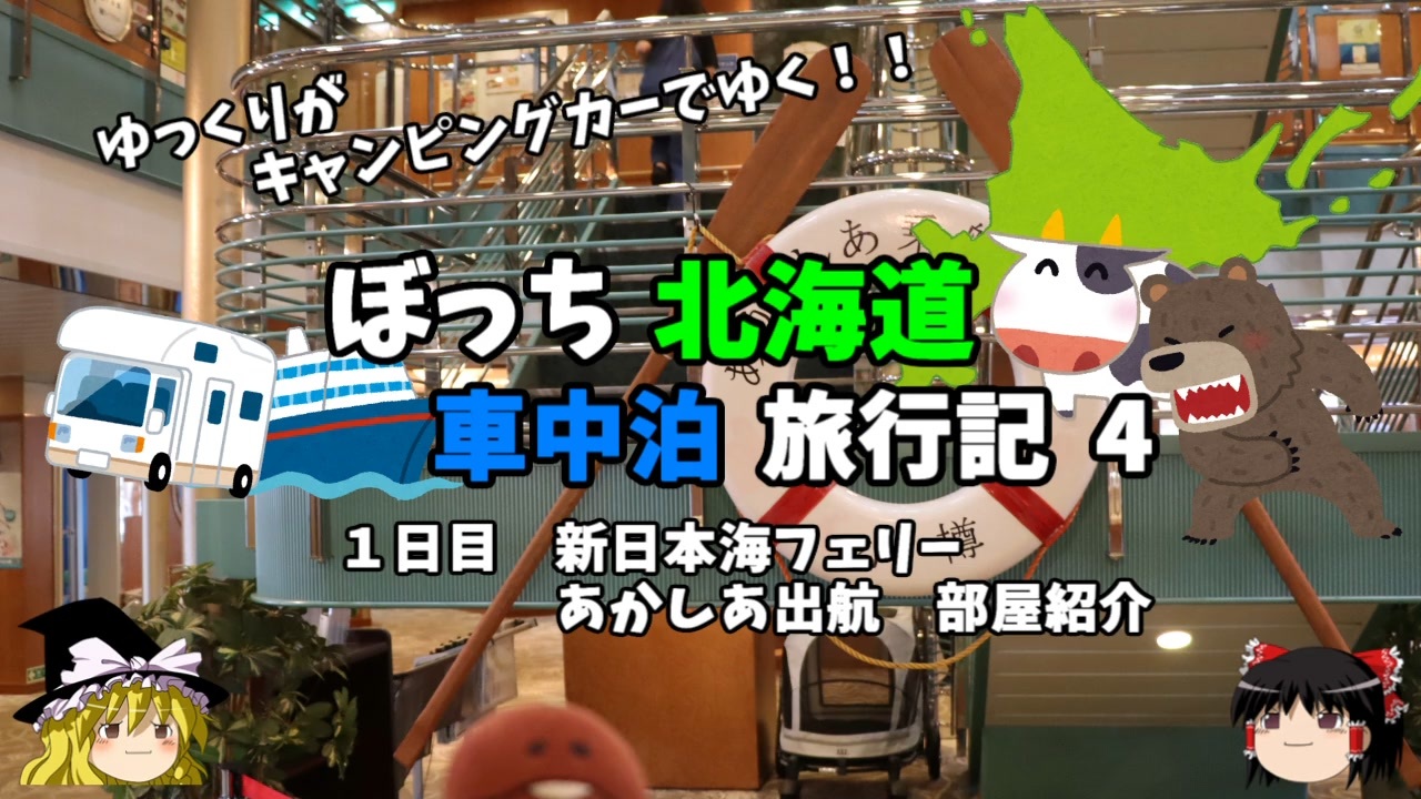 <span style="color: #ff0000; font-size: medium;"><u>※Youtubeで1話分、先行配信中 </u></span><br><span style="color: #0000ff; font-size: medium;"> <a href="http://www.youtube.com/c/なめこのぼっち旅" target="_blank" rel="noopener nofollow">http://www.youtube.com/c/なめこのぼっち旅</a></span><br><br><br>2022年GWに北海道にキャンピングカーで行ってきました!<br>その模様をお伝えします!<br><br>フェリーの出航と、今回利用した部屋を紹介します!<br><br><span style="color: #ff0000;">コミュニティー→co2910020</span><br><br>twitter→<a href="https://twitter.com/ryontan" target="_blank" rel="noopener nofollow">https://twitter.com/ryontan</a><br><br><a href="https://www.nicovideo.jp/watch/sm40881758" class="watch">sm40881758</a>← 前回 <span style="color: #ff0000;">次回 →</span><a href="https://www.nicovideo.jp/watch/sm40948475" class="watch">sm40948475</a><br><br>今作 北海道車中泊旅行記→<a href="https://www.nicovideo.jp/mylist/73483035" target="_blank" rel="noopener">mylist/73483035</a><br>前作 モルディブ旅行記→<a href="https://www.nicovideo.jp/mylist/72339602" target="_blank" rel="noopener">mylist/72339602</a><br>東欧旅行記→<a href="https://www.nicovideo.jp/mylist/70339665" target="_blank" rel="noopener">mylist/70339665</a><br>解説・雑談系→<a href="https://www.nicovideo.jp/mylist/63171869" target="_blank" rel="noopener">mylist/63171869</a><br>スイス旅行記<span style="color: #000000; font-size: 14px;">→</span><a href="https://www.nicovideo.jp/mylist/68347869" target="_blank" rel="noopener">mylist/68347869</a><br>スペイン周遊記→<a href="https://www.nicovideo.jp/mylist/64537827" target="_blank" rel="noopener">mylist/64537827</a><br>韓国トルコ旅行記→<a href="https://www.nicovideo.jp/mylist/63654428" target="_blank" rel="noopener">mylist/63654428</a><br>車中泊旅行記→<a href="https://www.nicovideo.jp/mylist/54706524" target="_blank" rel="noopener">mylist/54706524</a><br>久米島(沖縄)旅行記→<a href="https://www.nicovideo.jp/mylist/63059251" target="_blank" rel="noopener">mylist/63059251</a><br>イギリスタイ旅行記→<a href="https://www.nicovideo.jp/mylist/60044833" target="_blank" rel="noopener">mylist/60044833</a><br>クルーズ旅行記→<a href="https://www.nicovideo.jp/mylist/57397685" target="_blank" rel="noopener">mylist/57397685</a><br>ドイツ周遊記→<a href="https://www.nicovideo.jp/mylist/54938346" target="_blank" rel="noopener">mylist/54938346</a><br>北海道旅行記→<a href="https://www.nicovideo.jp/mylist/52618057" target="_blank" rel="noopener">mylist/52618057</a><br>アメリカ横断記→<a href="https://www.nicovideo.jp/mylist/48621785" target="_blank" rel="noopener">mylist/48621785</a><br>イタリア周遊記→<a href="https://www.nicovideo.jp/mylist/45763559" target="_blank" rel="noopener">mylist/45763559</a><br>NY旅行記→<a href="https://www.nicovideo.jp/mylist/44343854" target="_blank" rel="noopener">mylist/44343854</a>