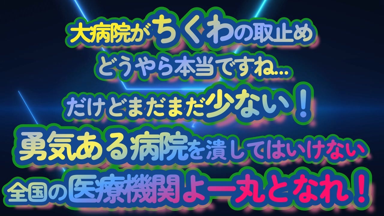 どうやら大病院のちくわ取止めは本当のようです...<br>この流れを断ち切られる前に全国の医療機関が目覚めてくれる事を祈ります!<br>病院は本来人間の免疫向上の手助けをし人々の健康を維持する所です...<br>切ったり貼ったりヤク中にして金を儲けたり毒を喰わせる屠殺会場ではありません...