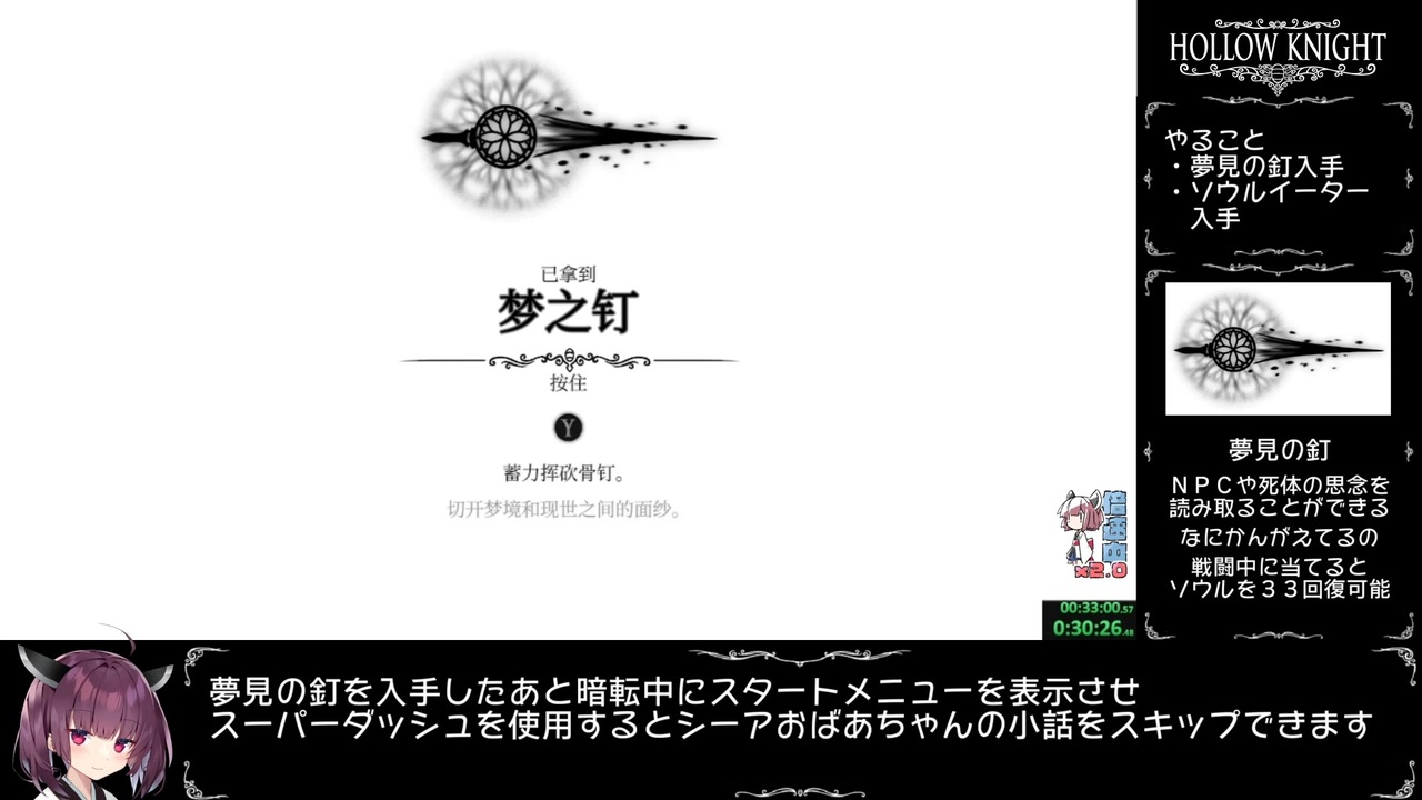 心眼を習得するパート<br><br>Hollow Knightのスピードランカテゴリー、112%+APB NMGの再走記録を東北きりたんが解説した動画です。<br>今回の記録はロードレスタイム:3:47:56、リアルタイム:4:07:44でした。<br><br>Hollow Knight steamページ<br><a href="https://store.steampowered.com/app/367520/Hollow_Knight/?l=japanese" target="_blank" rel="noopener nofollow">https://store.steampowered.com/app/367520/Hollow_Knight/?l=japanese</a><br><br>---------------------参考にさせていただいた動画など--------------------------<br>xion兄貴<br><a href="https://www.nicovideo.jp/watch/sm40861017" class="watch">sm40861017</a><br>さかな兄貴<br><a href="https://www.nicovideo.jp/watch/sm40045791" class="watch">sm40045791</a><br>HollowKnight_JP_discordサーバー<br><a href="https://twitter.com/un_yo_san/status/1456597988944408577" target="_blank" rel="noopener nofollow">https://twitter.com/un_yo_san/status/1456597988944408577</a><br>英語版wiki<br><a href="https://hollowknight.fandom.com/wiki/Hollow_Knight_Wiki" target="_blank" rel="noopener nofollow">https://hollowknight.fandom.com/wiki/Hollow_Knight_Wiki</a><br>日本語版wiki<br><a href="https://wikiwiki.jp/hollowknight/" target="_blank" rel="noopener nofollow">https://wikiwiki.jp/hollowknight/</a><br>----------------------------------------------------------------------------------<br>無編集版<br><a href="https://www.youtube.com/watch?v=CG7GtTWUulY" target="_blank" rel="noopener nofollow">https://www.youtube.com/watch?v=CG7GtTWUulY</a><br><br>前シリーズはこちら:<a href="https://www.nicovideo.jp/series/289523" target="_blank" rel="noopener">series/289523</a><br><br>前:<a href="https://www.nicovideo.jp/watch/sm40916057" class="watch">sm40916057</a><br>次:<a href="https://www.nicovideo.jp/watch/sm41023309" class="watch">sm41023309</a><br>
