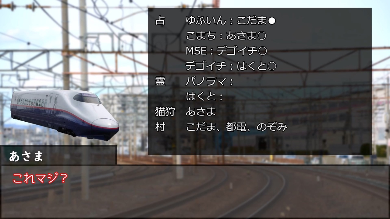 今更ながらソーのラブ&サンダーを観ました。面白かったです。<br>前村とは打って変わって少人数の、そしてFO村となります。<br>殺意高めの殴り合いをお楽しみください。<br><br>11C猫FO:村1/占2/霊1/狩1/猫1/狼3/狂1/狐1<br><br>2025/03/20 19:00<br>ニコニコ動画の上書き修正開放キャンペーンに伴い、一部修正を行いました。<br>それにより、一部コメント箇所がずれている場所があるかも知れません。<br>ご了承ください。<br><br>Twitterで考察して頂ける方は#電車で人狼 を入れて呟いていただけると探しやすいです。<br>part3⇒<a href="https://www.nicovideo.jp/watch/sm40519472" class="watch">sm40519472</a> 3日目⇒<a href="https://www.nicovideo.jp/watch/sm40953726" class="watch">sm40953726</a><br><br>電車で人狼!マイリスト <a href="https://www.nicovideo.jp/mylist/72946958" target="_blank" rel="noopener">mylist/72946958</a><br>電車で人狼! 支線編(解説動画) <a href="https://www.nicovideo.jp/mylist/79077747" target="_blank" rel="noopener">mylist/79077747</a><br>人狼動物園マイリスト <a href="https://www.nicovideo.jp/mylist/72986089" target="_blank" rel="noopener">mylist/72986089</a><br><br><a target="_blank" href="https://qa.nicovideo.jp/faq/show/19424?site_domain=default" style="font-size: 13px;color: #657586; text-decoration: underline; line-height: 1.4">この動画は投稿者によって修正されました</a>