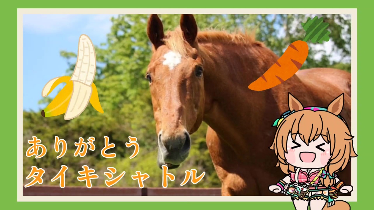 2022/08/17 午前5時頃<br>タイキシャトルが馬房で亡くなりました<br>老衰による心不全だそうです。<br><br>自分はウマ娘からその存在を知って<br>動画などでタイキシャトルの様子を見るのが最近の楽しみでした<br>今日もドットさんとのおやつタイムや鼻ドンしている様子を見れると思っていました<br>推しが亡くなるのはツラいし…<br>会いに行きたかったし…(〇´^ `〇)<br><br>でも、きっとシャトじいじは今日まで幸せに生きてこれたよね<br>怪我や病気で苦しみながらでなくて良かったんだ<br><br>天国でも元気に走ってね。<br>ありがとう、タイキシャトル