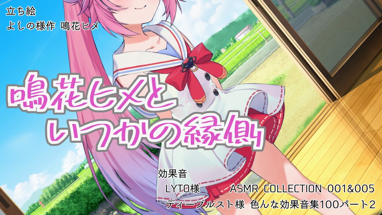 いつかの縁側。誰かがヒメちゃんに耳かきされる話です。<br>今回は台詞少な目。左右同時じゃない耳かきです。<br>ちゃんと出来ているかよく分からない方言でお送りします。<br><br><strong>イヤホン・ヘッドホンを推奨です。</strong><br><br>■声<br>ガイノイド Talk <a href="https://www.gynoid.co.jp/" target="_blank" rel="noopener nofollow">https://www.gynoid.co.jp/</a><br><br>■立ち絵<br>よしの様作 鳴花ヒメ <a href="https://seiga.nicovideo.jp/seiga/im10910510" target="_blank" rel="noopener nofollow">https://seiga.nicovideo.jp/seiga/im10910510</a><br><br>■効果音<br>LYTO ASMR COLLECTION vol.001 <a href="https://www.dlsite.com/home/work/=/product_id/RJ158111.html" target="_blank" rel="noopener nofollow">https://www.dlsite.com/home/work/=/product_id/RJ158111.html</a><br>LYTO ASMR COLLECTION vol.005 <a href="https://www.dlsite.com/home/work/=/product_id/RJ159098.html" target="_blank" rel="noopener nofollow">https://www.dlsite.com/home/work/=/product_id/RJ159098.html</a><br>ディーブルスト様作 色んな効果音集100 <a href="https://www.dlsite.com/maniax/circle/profile/=/maker_id/RG04303.html" target="_blank" rel="noopener nofollow">https://www.dlsite.com/maniax/circle/profile/=/maker_id/RG04303.html</a><br>■画像<br>kayu*様作 フリー素材*bottle <a href="https://www.pixiv.net/artworks/69224882" target="_blank" rel="noopener nofollow">https://www.pixiv.net/artworks/69224882</a>