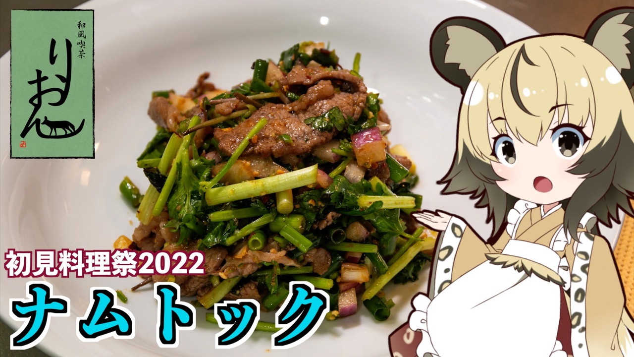 今回はちくわかさん主催「初見料理祭2022」ということで<br>「ナムトック」を作っていきましょう。<br><br>タイのハーブサラダとのことですが、<br>タイ料理ってカレーやガパオライス、カオマンガイくらいしか食べた事ないので、<br>屋台でも定番?らしいナムトックを作ってみました。<br><br><br>■材料<br>牛肉(豚肉) 300g<br>パクチー 1株<br>スペアミント 3g<br>小ネギ 5本<br>アーリーレッド 半玉<br>こぶみかんの葉(無くても大丈夫です) 1枚<br>生米 10g<br>乾燥唐辛子 5本<br>塩・胡椒 お好みで<br>砂糖 大さじ1.5<br><br>タレ<br>青唐辛子 4本<br>砂糖 大さじ1<br>ナンプラー(または醤油) 25mL<br>レモン汁 20mL<br><br>■所要時間<br>作業時間:20分<br><br><br>youtube:<a href="https://youtu.be/NukB3iMxC5w" target="_blank" rel="noopener nofollow">https://youtu.be/NukB3iMxC5w</a><br>twitter:@lycaon_kitchen<br><br>りおんの和風喫茶:<a href="https://www.nicovideo.jp/series/77190" target="_blank" rel="noopener">series/77190</a><br>おつかれごはん:<a href="https://www.nicovideo.jp/series/155690" target="_blank" rel="noopener">series/155690</a><br>手作り和菓子でちょっとひとやすみしませんか?:<a href="https://www.nicovideo.jp/series/155691" target="_blank" rel="noopener">series/155691</a><br><br>立ち絵:星華 彩二魔 様<br>イラスト:いらすとや、AWD kitchen<br>音源:DOVA-SYNDROME、ポケットサウンド<br>音声:VOICEROID2 紲星あかり + exVOICE