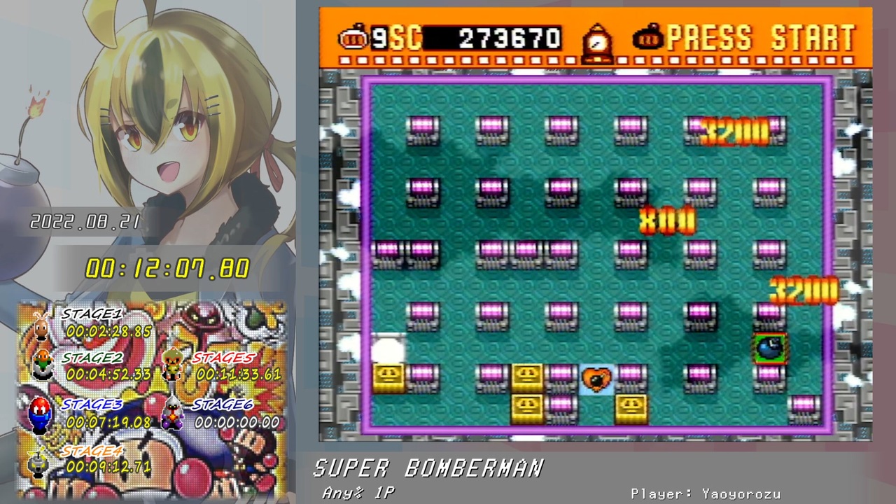 <span style="font-size: 18px;"><strong>My New Gear...</strong></span><br><br>とりあえずQSの力を手に入れて6面がマシになった。<br>これで6-3終了までで1秒33リードってマジ?T.A.S.に肉薄するくらいの記録が現実味帯びてきてるんですけど。<br>敗因は6-4と6-6。コレだけ。まだ走れる。<br><br>世界順位はここから閲覧できます↓<br><a href="https://www.speedrun.com/super_bomberman" target="_blank" rel="noopener nofollow">https://www.speedrun.com/super_bomberman</a><br><br><span style="color: #ff0000;">Youtubeチャンネル開設しました!基本的には生放送のアーカイブ置き場です。</span><br><a href="https://www.youtube.com/channel/UCPUsX1jLhCUuyNqfWgYdH0w" target="_blank" rel="noopener nofollow">https://www.youtube.com/channel/UCPUsX1jLhCUuyNqfWgYdH0w</a><br><br>ボンバーマンRTA → <a href="https://www.nicovideo.jp/mylist/59356396" target="_blank" rel="noopener">mylist/59356396</a><br>その他投稿シリーズPart1まとめ → <a href="https://www.nicovideo.jp/mylist/66405907" target="_blank" rel="noopener">mylist/66405907</a><br><br>Twitter → <a href="https://twitter.com/YaoYorozu_8mi" target="_blank" rel="noopener nofollow">https://twitter.com/YaoYorozu_8mi</a><br>コミュニティ → co3843553