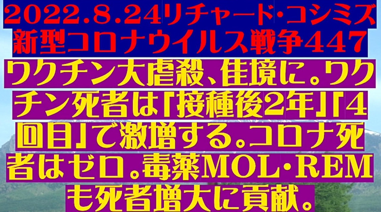 <span style="color: #cc4125;"><strong>「 テーマ:新型コロナウイルス戦争 447 」</strong></span><br><br><span style="color: #ff0000;"><strong>「『 ワクチン大虐殺、佳境に 』。ワクチン死者は、『 接種後2年 』・『 接種4回目 』で激増する。 <br> コロナ死者はゼロ。毒薬『 モルヌピラビル・レムデシビル 』も死者増大に貢献 」</strong></span><br><br>◐オミクロン株に何の効果もない武漢株用ワクチンを4回打てば、オミクロン株に感染して当たり前。<br> 死体の山が築かれる。<br><br>◐ワクチンによるスパイクタンパクは、卵巣を直撃する。結果として、流産と新生児の異常が多発。<br><br>◐オミクロン死者は、一人もいない。ワクチン副反応(免疫不全・血栓症・癌等)と<br> 「レムデシビル&モルヌピラビル死者」が1日で343人。<br><br>◐アメリカ国立衛生研究所の「アンソニー・ファウチ」は、ワクチン戦争の敗北を予測して、敵前逃亡。<br> 「モルヌピラビル・レムデシビルが死因」と、世界が騒ぎ出した。<br><br>◐さらに多くの人が、「ワクチン・モルヌピラビル・レムデシビル」で殺されて初めて、<br> 日本人は「政府が国民を故意に殺している」と気が付く。<br><br><strong>*「フォロー」・「ニコニ広告」・「いいね!」・「情報拡散」等、ご協力下さい。 リチャード・コシミズ</strong><br><br><span style="color: #38761d;">◆</span><span style="color: #38761d;"><strong>リチャード・コシミズ 公式 ブログ</strong></span><br> <a href="https://ameblo.jp/ineversurrender/" target="_blank" rel="noopener nofollow">https://ameblo.jp/ineversurrender/</a><br><br><span style="color: #38761d;">◆</span><span style="color: #38761d;"><strong>リチャード・コシミズ 公式 ホームページ<br> </strong></span><a href="http://richardkoshimizu.boo.jp/" target="_blank" rel="noopener nofollow">http://richardkoshimizu.boo.jp/</a><br><br><span style="color: #38761d;">◆</span><span style="color: #38761d;"><strong>リチャード・コシミズ 講演会 公式 動画ギャラリー</strong></span><br> <a href="http://www.t-sskk.com/richardkoshimizu/video-gallery/index.html" target="_blank" rel="noopener nofollow">http://www.t-sskk.com/richardkoshimizu/video-gallery/index.html</a><br>